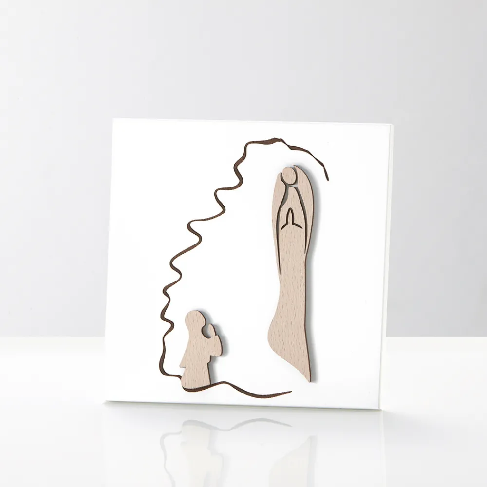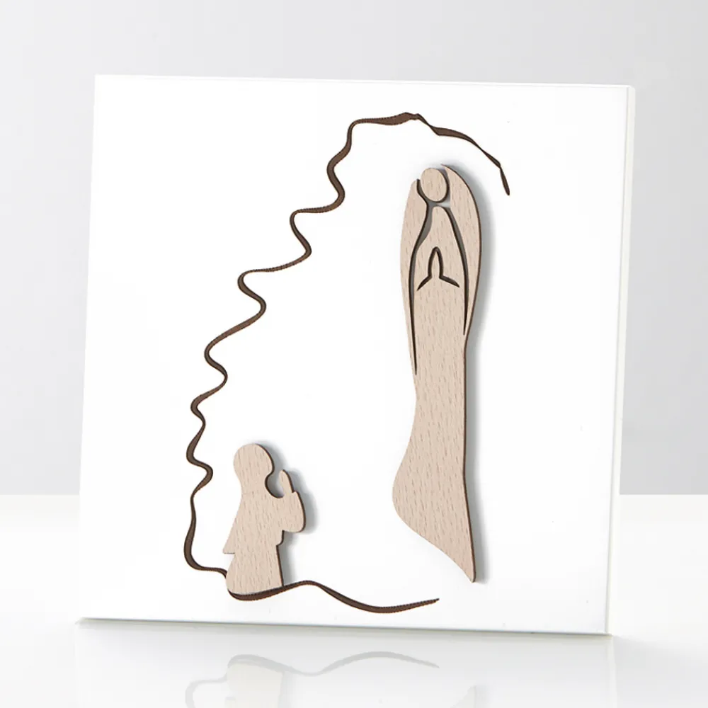 Heiliges Bild mit der Darstellung der Erscheinung der Madonna aus Naturholz und Lasergravur. Weiß lackierte Holzplatte mit Stützfuß und Loch zum Aufhängen an der Wand.