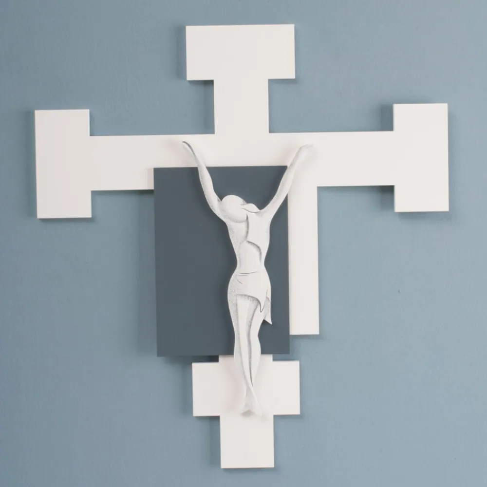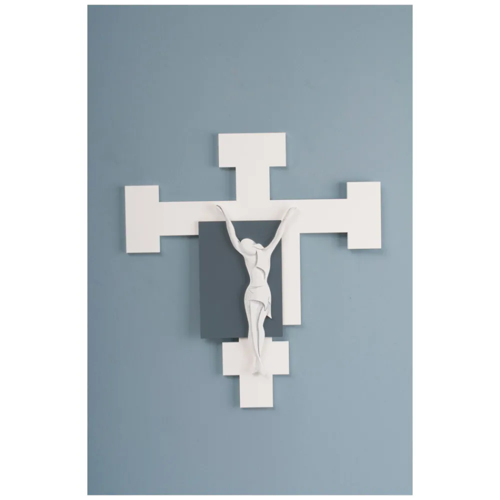 Weißes Kruzifix mit kieselfarbenen Details, hergestellt in Italien