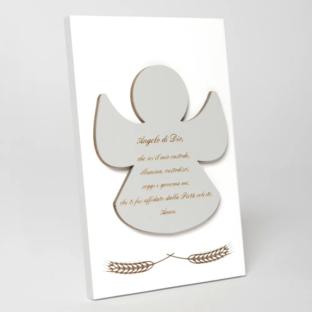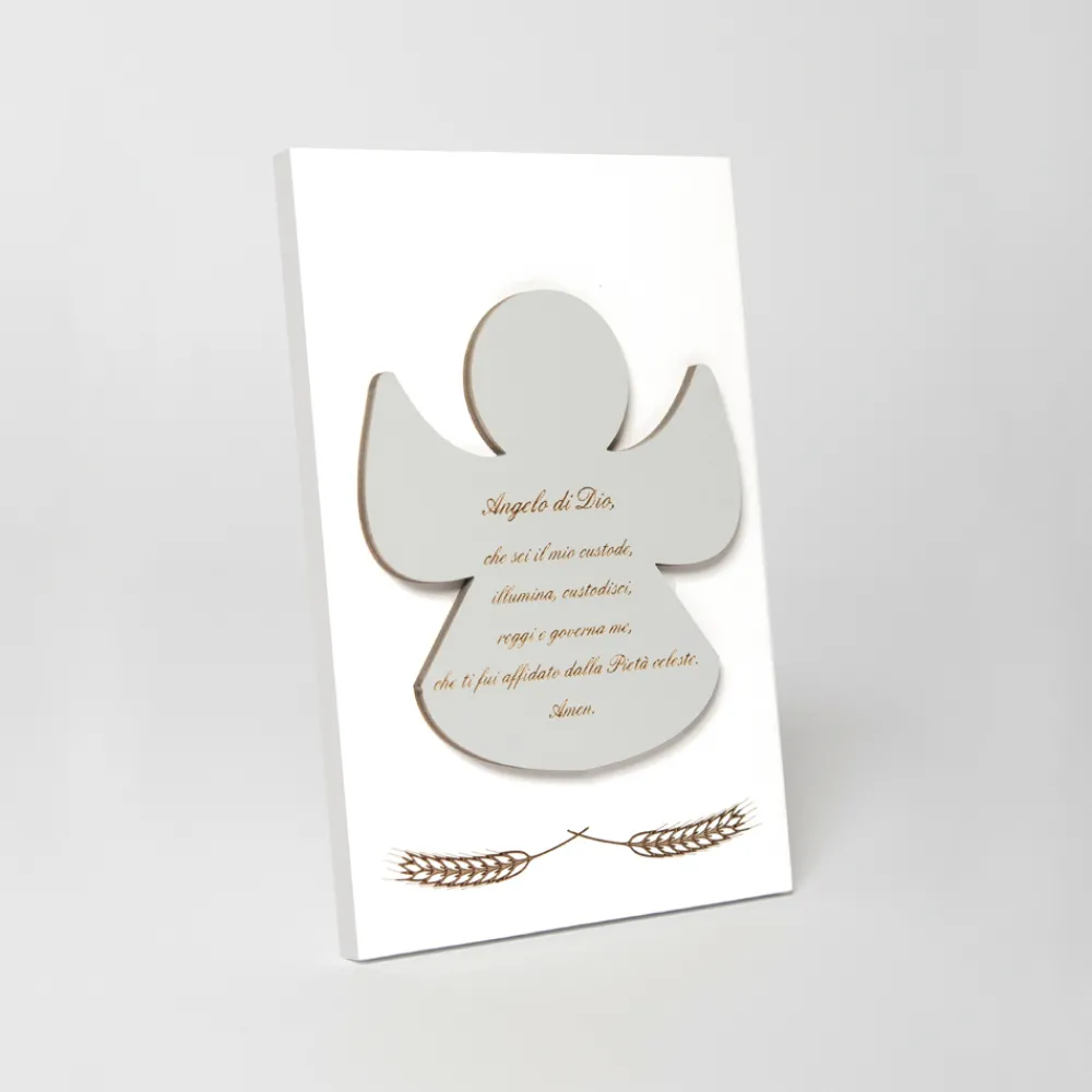 Heiligenbild mit Applikation eines Engels mit eingraviertem Gebet. Weiß lackierte Holzplatte mit Stützfuß. Anwendung in Staubgrau.