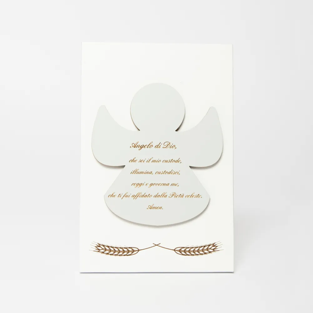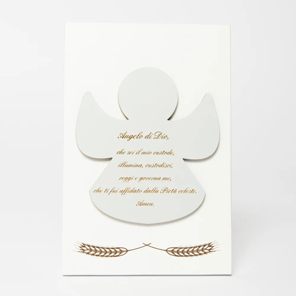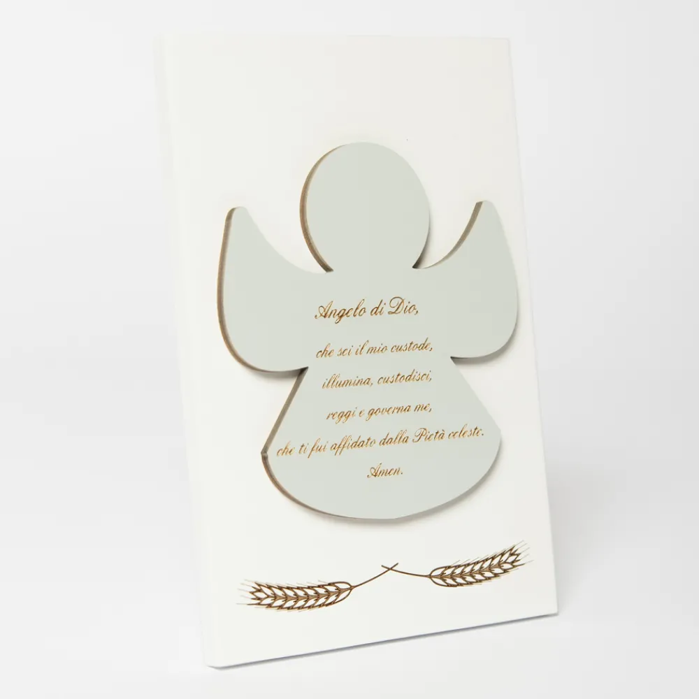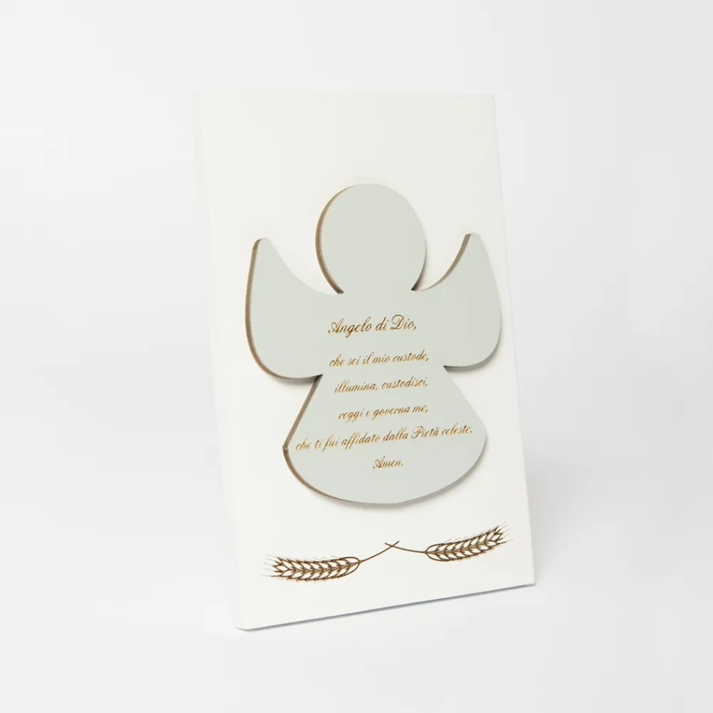 Heiligenbild mit Applikation von Engel und Gebet, eingraviert, staubgrau, hergestellt in Italien