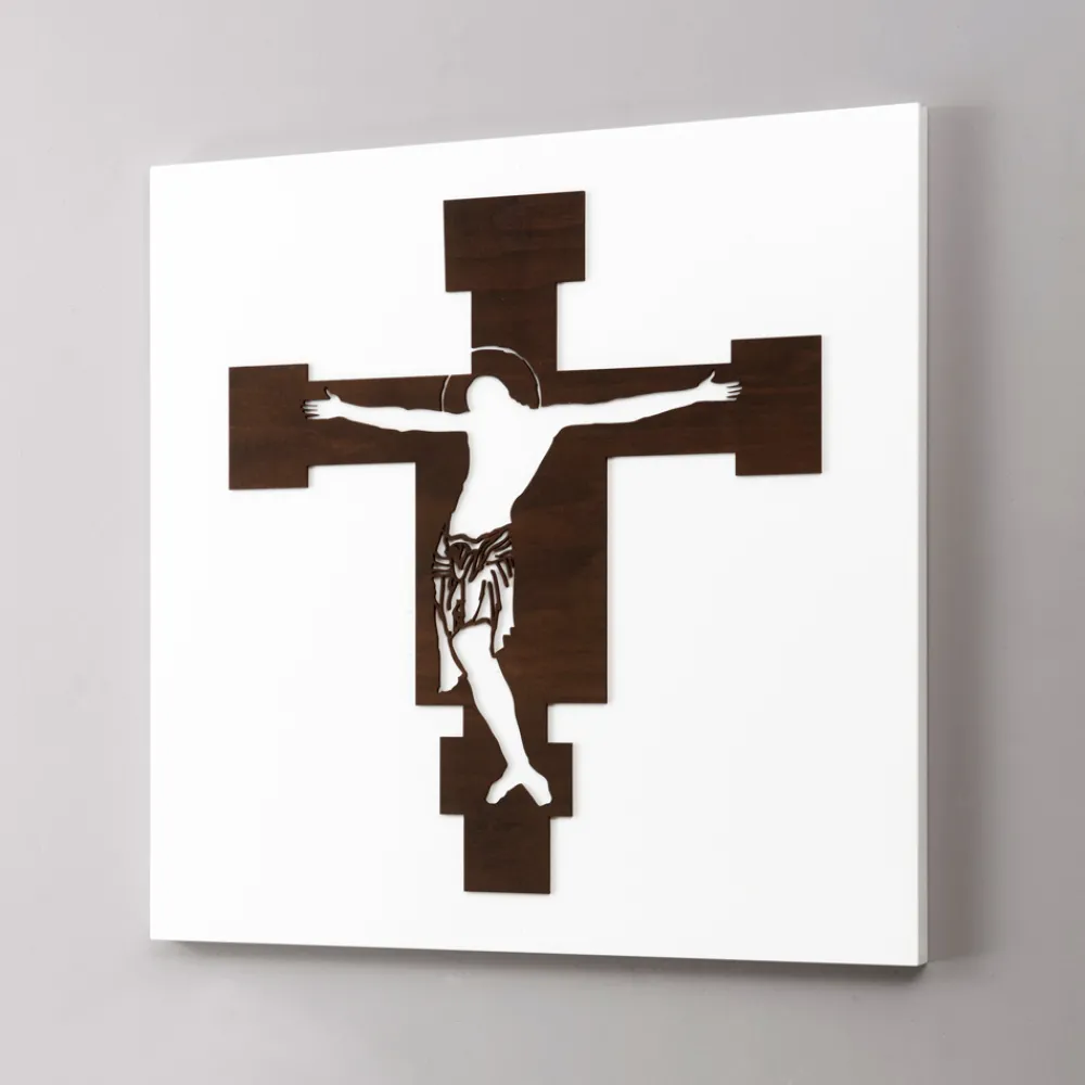 Sakraler Rahmen aus weiß lackiertem Holz mit Applikation eines Kruzifixes aus Wengeholz.