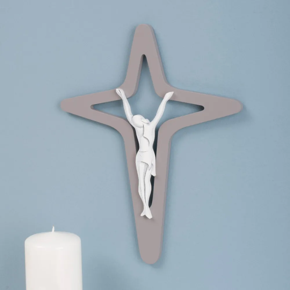 Graues Kruzifix mit lasergraviertem Christus am Kreuz, hergestellt in Italien