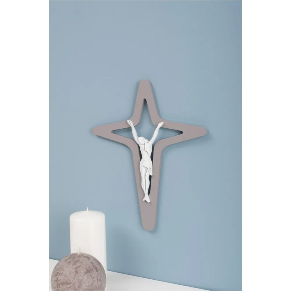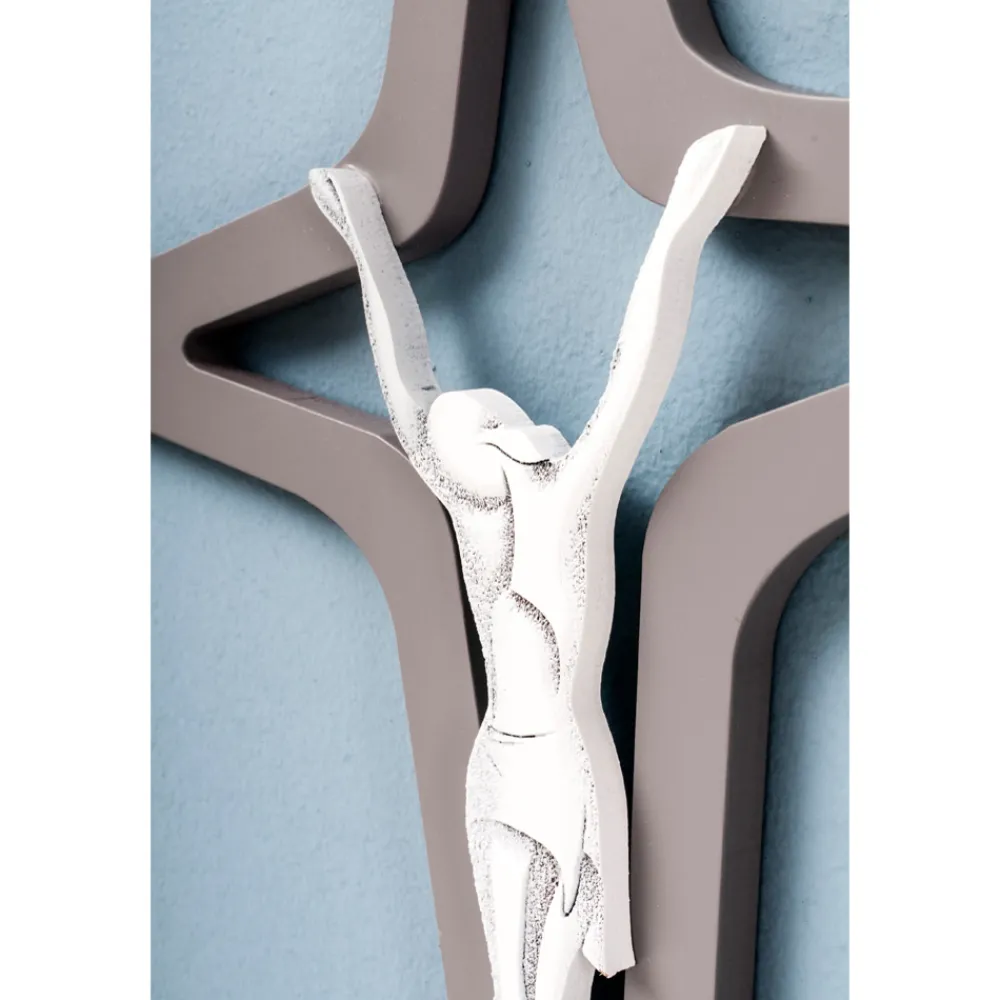 Kruzifix aus grau lackiertem Holz mit Christusapplikation aus weiß lackiertem Holz mit leichten Einschnitten , um die Merkmale des Körpers hervorzuheben .