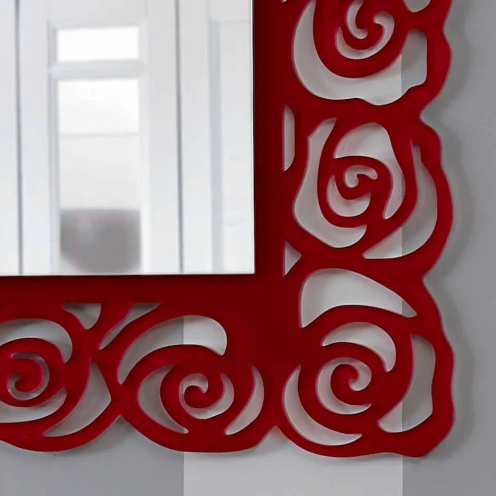 Moderner und eleganter rechteckiger Designspiegel mit rotem Plexiglas-Rosenrahmen, hergestellt in Italien.