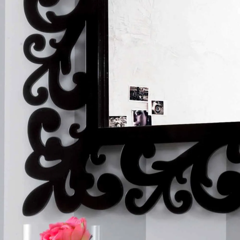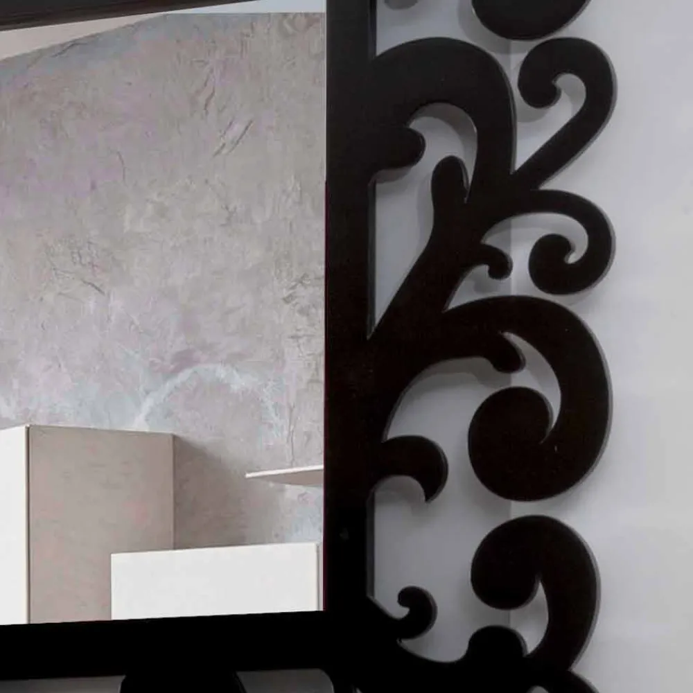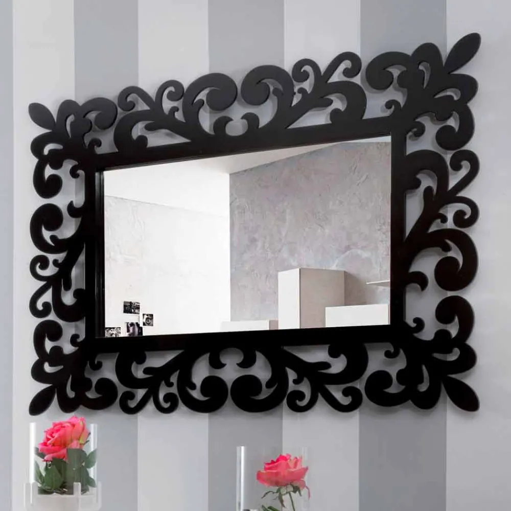 Polierter schwarzer Holzspiegel mit rechteckigem Wanddesign mit dekoriertem Rahmen, hergestellt in Italien.