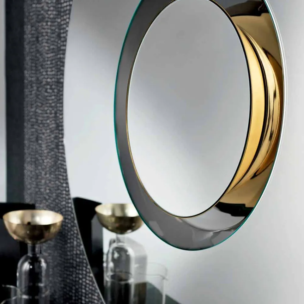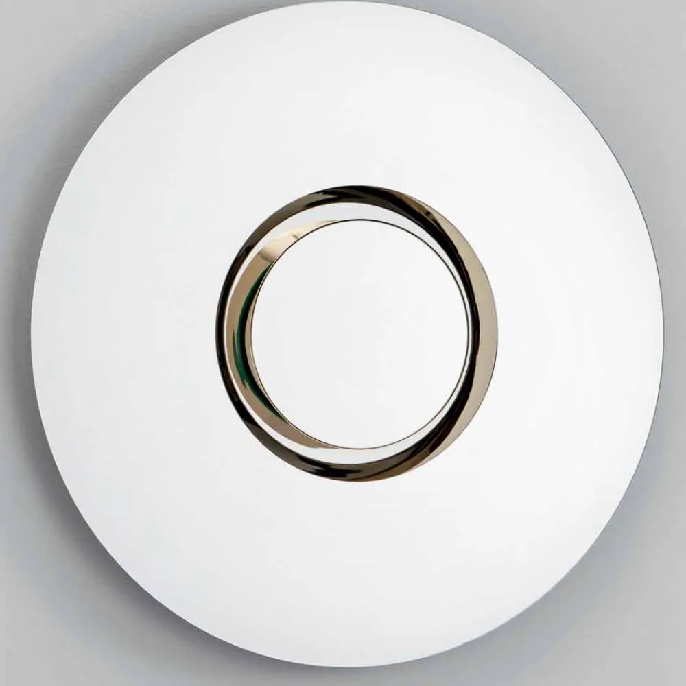 Der Wandspiegel hat ein rundes Design und zeichnet sich durch den abnehmbaren Mittelteil aus , der ihn originell und einzigartig macht: Tatsächlich ist er ein rundes und konzentrisches Möbelstück mit einem Mittelkreis aus goldenem Metall, das auch als Mittelstück verwendet werden kann.