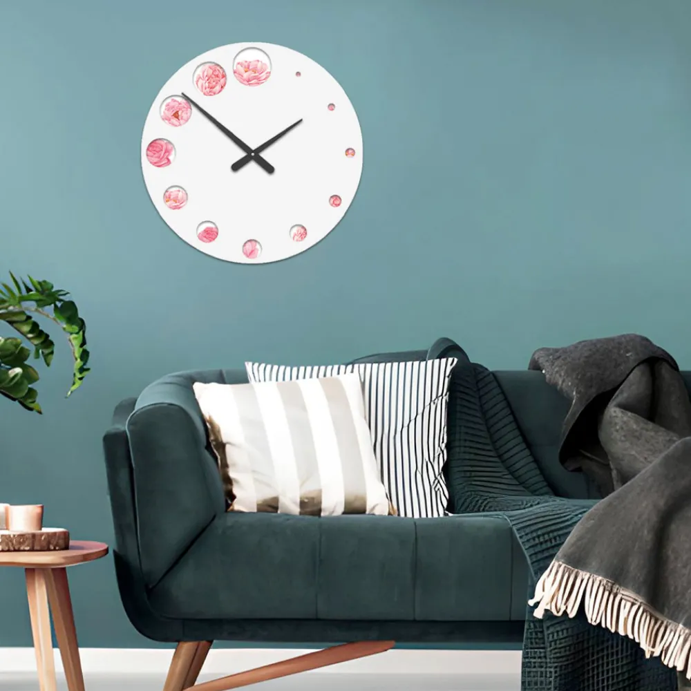 Uhr mit einem weißen MDF-Sockel mit Kamelienblütendruck aus verschiedenen Perspektiven, einem weißen Holzsockel darüber und bemalten Metallzeigern .