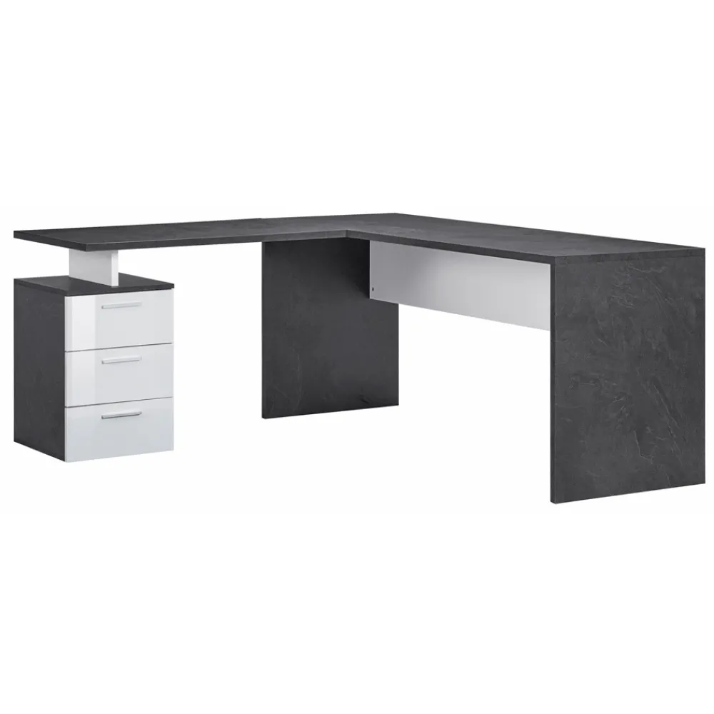 Der Schreibtisch zeichnet sich durch sein kantiges Design mit großzügiger rechtwinkliger Arbeitsplatte und einer Kommode mit 3 Schubladen aus.