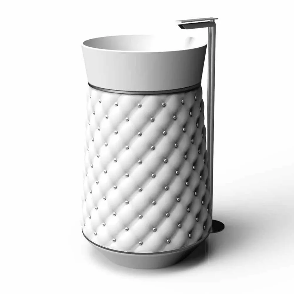 Freistehendes Waschbecken aus Solid Surface, erstmals gekennzeichnet durch ein neues Capitonnè-Finish, das die Eigenschaften des Materials hervorhebt, bei dem die Linearität der Formen durch eine ideale „Weichheit“ des fertigen Objekts ersetzt wird. Die raffinierte Linie mit Retro-Referenzen macht das Waschbecken „Elizabeth“ für jedes Badezimmer geeignet, das eine verlorene Eleganz auf Kosten minimaler Linien vorschlägt, indem es den Hauch von Persönlichkeit einfügt, der Elizabeth und dem Kunden gehört, der es wählt. Waschbecken in drei verschiedenen Farbvarianten erhältlich: Weiß-Weiß (RAL9003 + RAL9003), Weiß-Schwarz (RAL9003 + RAL9005) oder Weiß-Blau-Blau (RAL9003 + RAL5009).