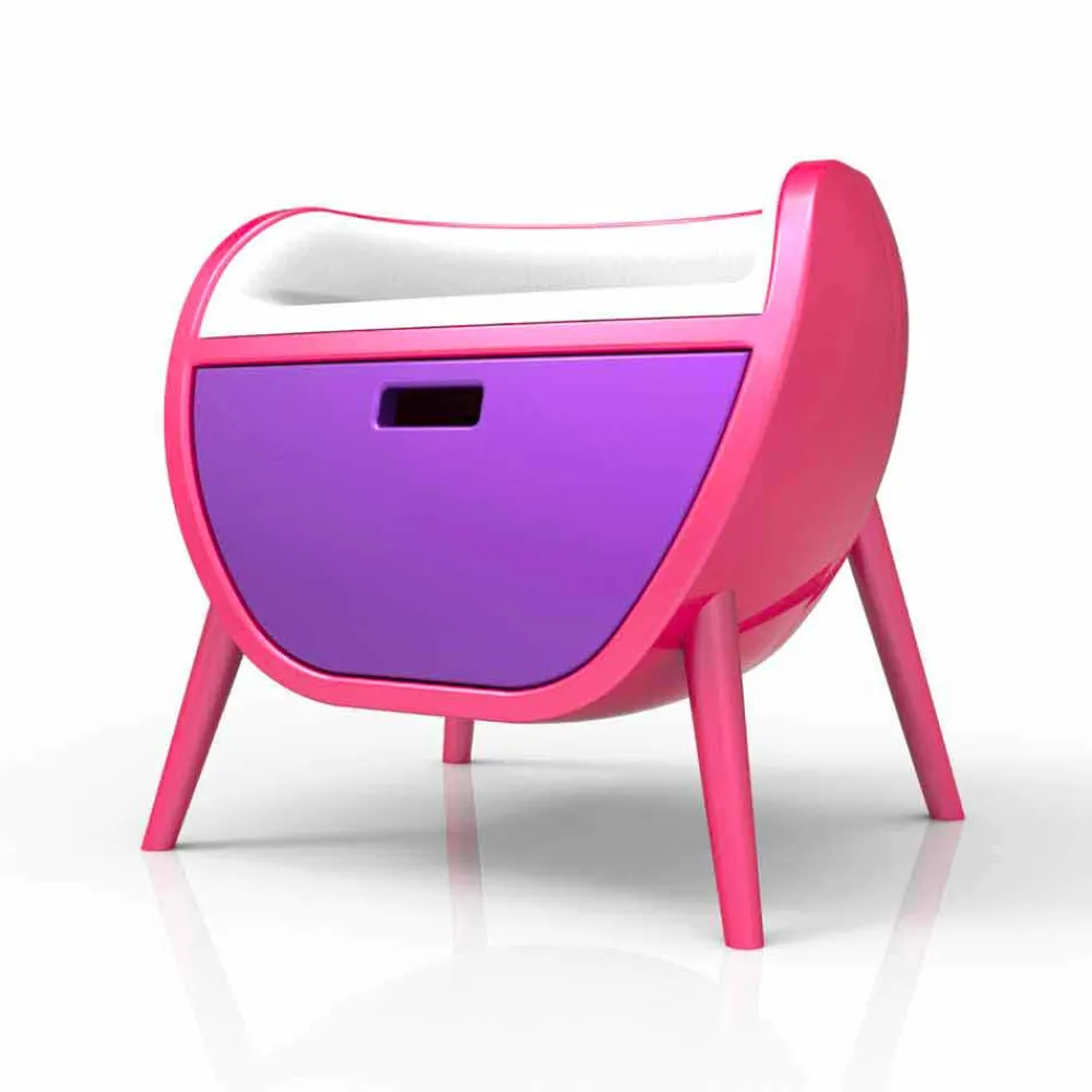 Es besteht aus Solid Surface; in verschiedenen Farben, frisch und jugendlich, auch mit stabilen Beinen aus strukturiertem Holz.