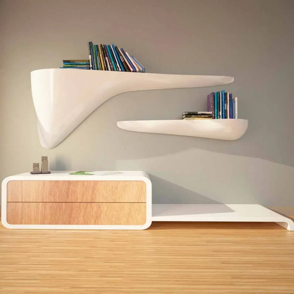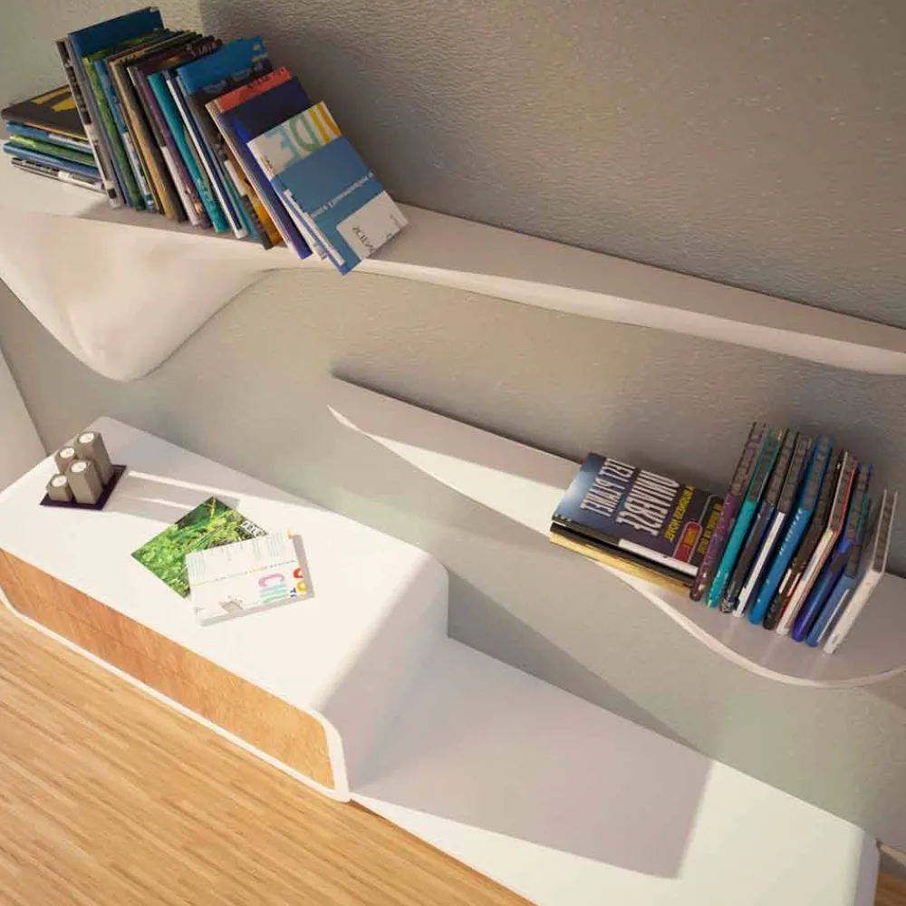 Sizzano ist ein Regal mit einer besonderen Form, das vollständig aus Solid Surface® besteht; perfekt für die Dekoration von Umgebungen mit Originalität und Klasse.