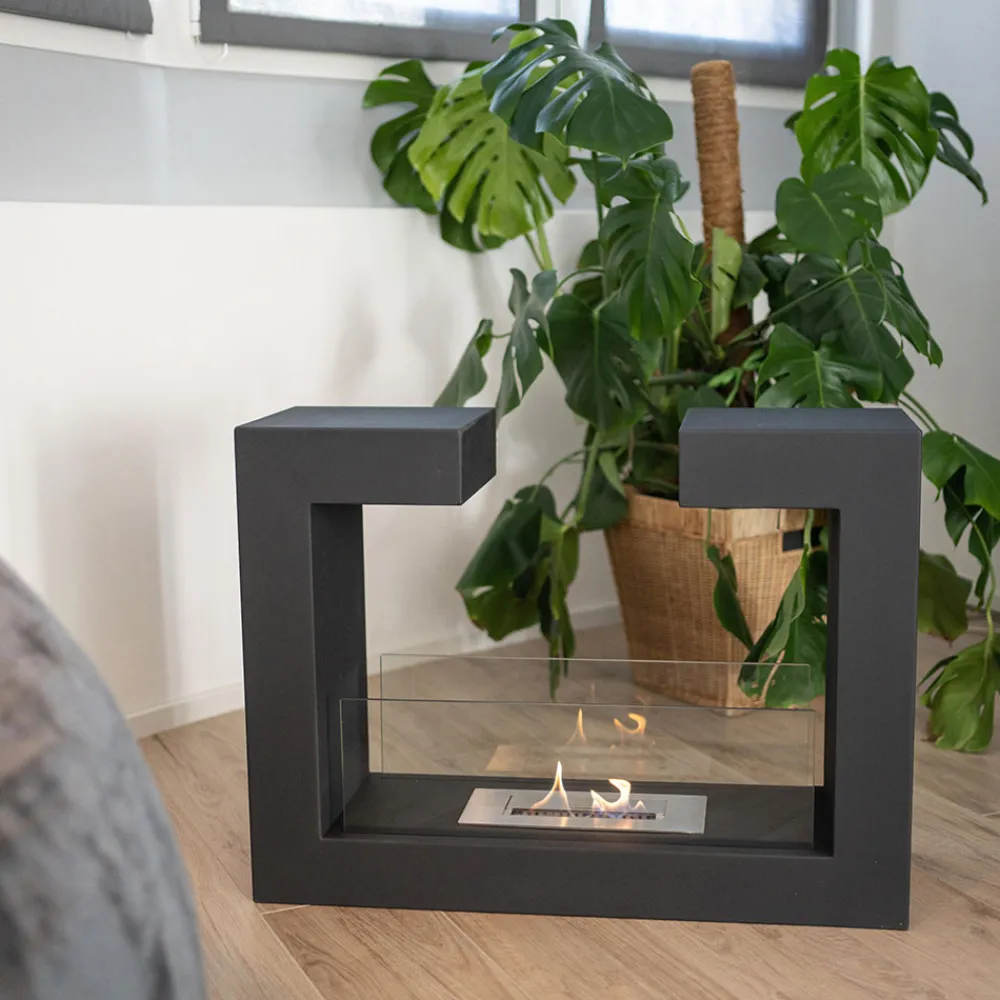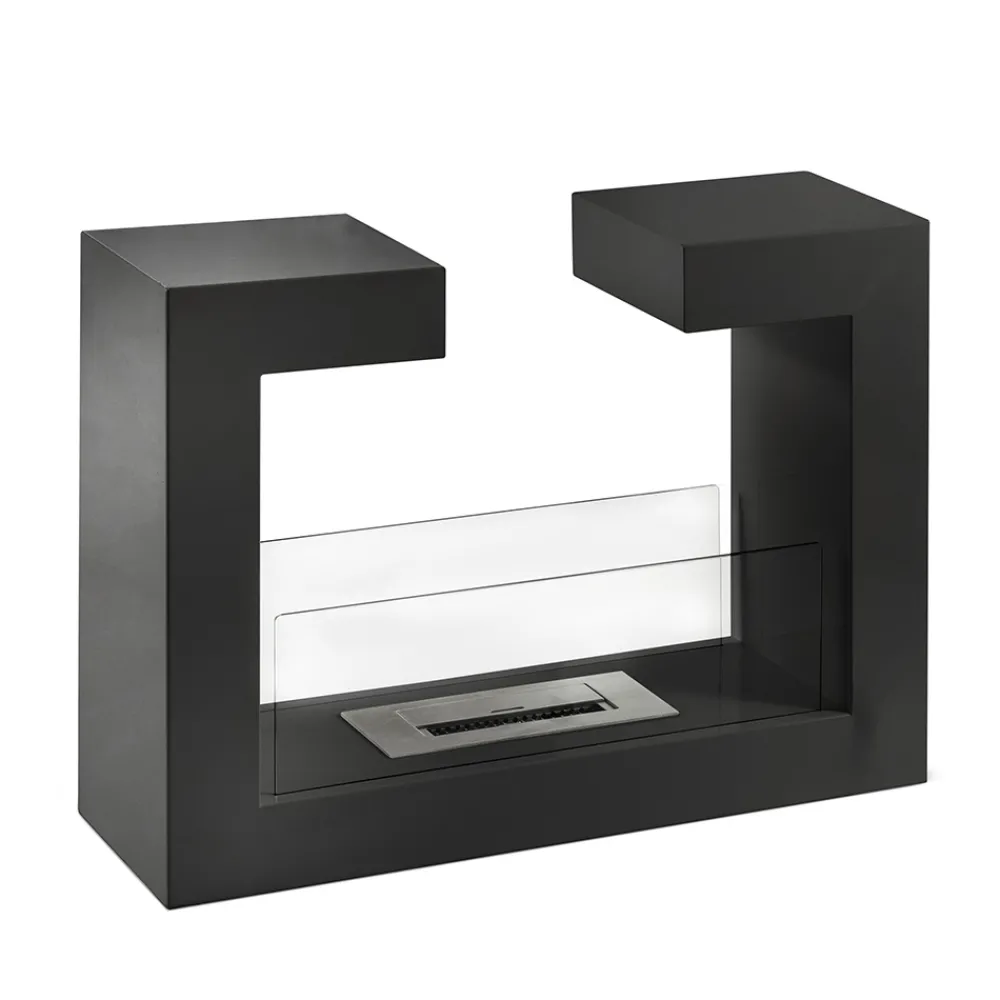 Bioethanol-Standkamin aus schwarzem Metall und gehärtetem Glas.