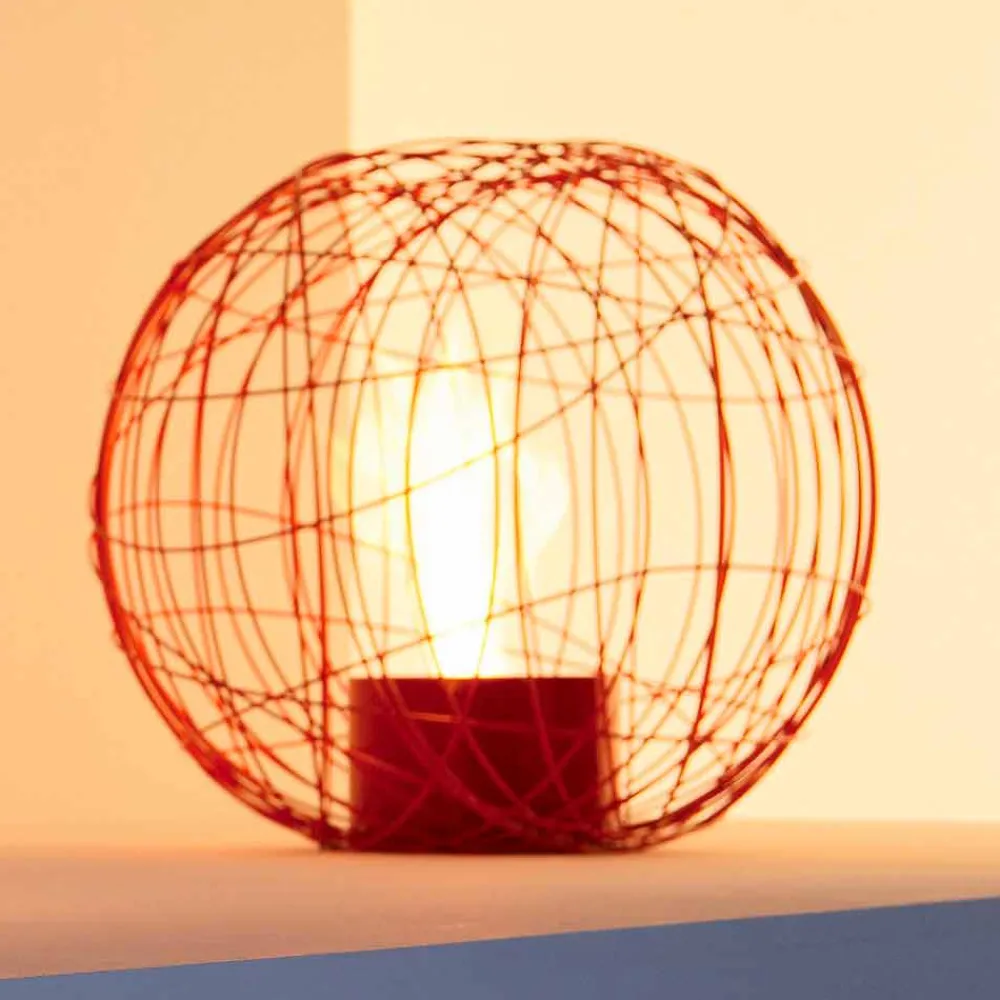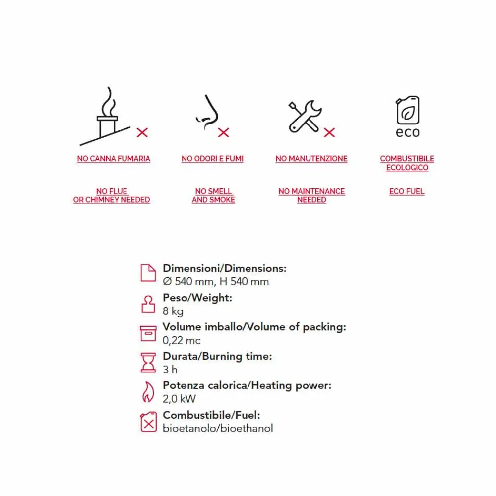 Eine kleine satinierte Edelstahl Brennkammer befindet sich in der Mitte des Kugelbodens. Die Kaminkugel besteht aus hochwertigen lackierten Stahl und ist in drei unterschiedlichen Farbausführungen erhältlich sind (weiß, rot und schwarz ). Jeder einzelne Stahldraht wurde mit Hand autogen ineinander verschweißt, jeder einzelne Draht in eine andere Richtung um so eine einzigartige Kugel zu erschaffen, die die Feuerstelle schützend umschließt. Der Kaminkörper wurde mit einer feuerfesten Lackierpistole lackiert und dann im Ofen beschichtet.