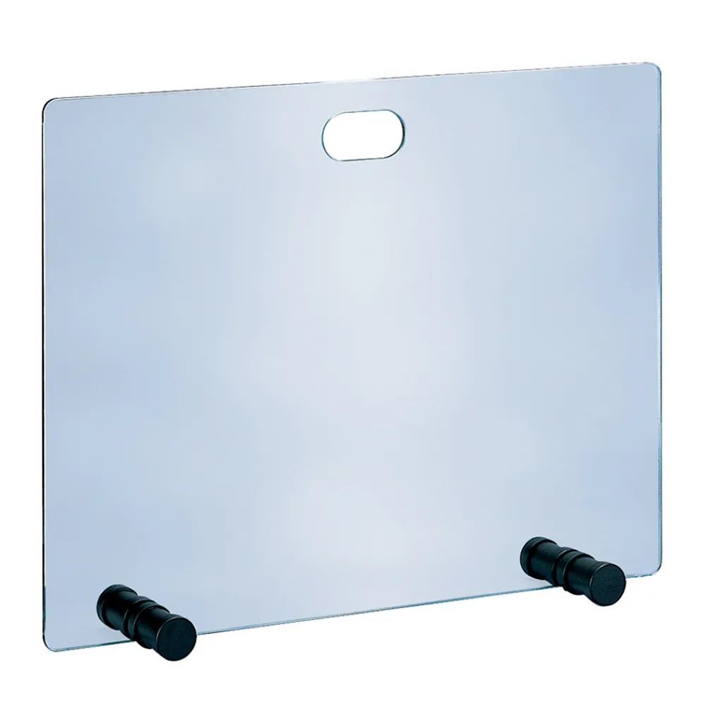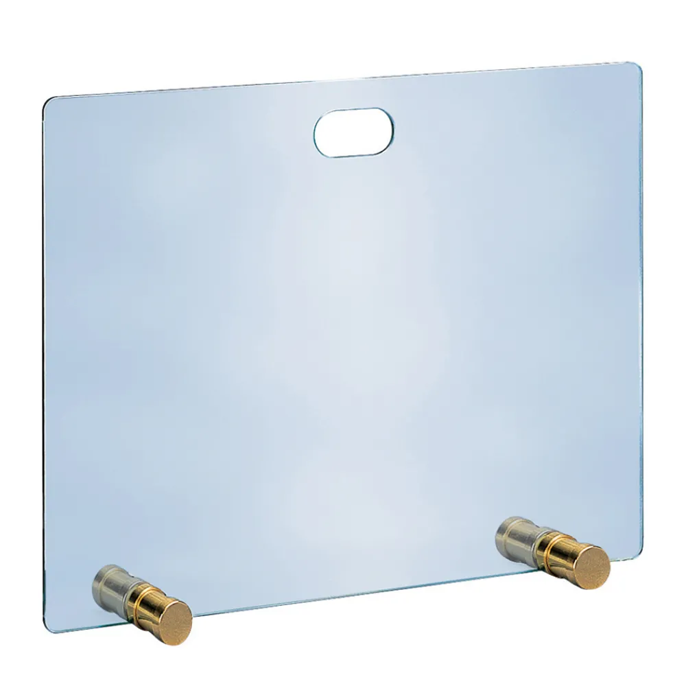 Das Paneel wird von Füßen getragen, deren Oberfläche einen schönen Kontrast zur Schlichtheit des Kristalls bildet und ihm einen Hauch von Eleganz verleiht. Diese Füße bieten nicht nur einen stabilen Halt, sondern verleihen dem Gesamtdesign auch ein unverwechselbares Aussehen. Der Griff, der in die Oberseite des Glitzerschutzes eingearbeitet ist, sorgt für eine einfache Handhabung, um ihn bei Bedarf zu bewegen oder neu zu positionieren.