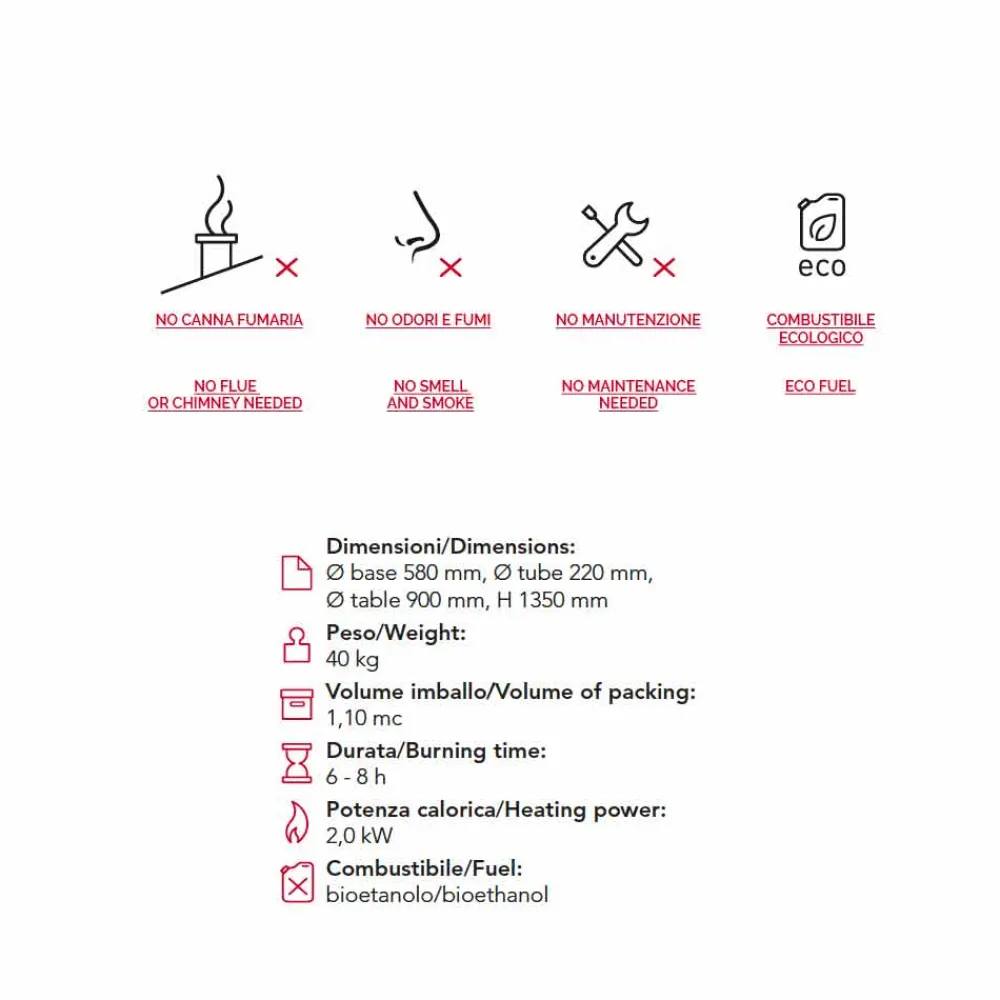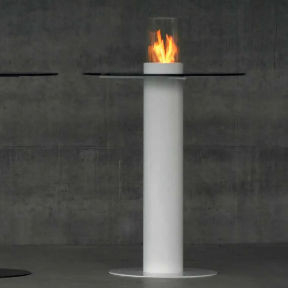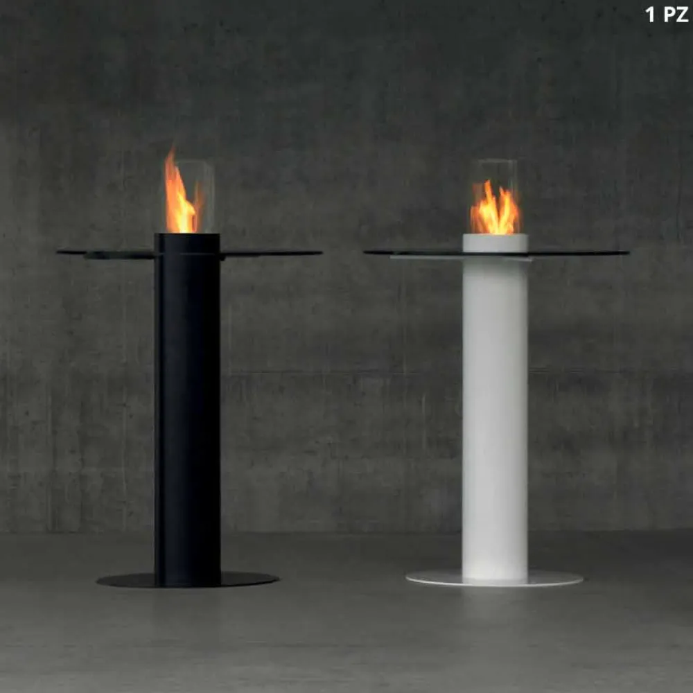 Der Säulenkamin besteht aus einer satinierten Edelstahl Brennkammer. Die Brennkammer Griff 20 ist im Fundament des Körpers integriert. Der Kamin Körper besteht aus lackierten Stahl, komplett mit einer Feuerschutzscheibe aus Borosilikatglas. Die Säule wurde mit einen Laser geschnitten und geschweißt, die Oberfläche mit Hand geschliffen und mit einem Sandstrahlgebläse von Rost, Farbe, Grat oder Ähnlichem befreit und aufgeraut und am Ende mit einer Epoxidbeschichtung bechichtet, damit wird die Oberfläche und jegliche Poren versiegelt und garantieren dem Produkt bei jeglicher Wetterlage eine außergewöhnliche Qualität. Die Lacke schwarz der weiß wurden unter sehr hohen Temperaturen tief in die Struktur beschichtet. Die Tischplatte besteht aus ultraklaren Temperglas und wurde in der Innenseite in der gleichen farbe der Struktur mit Hand lackiert.