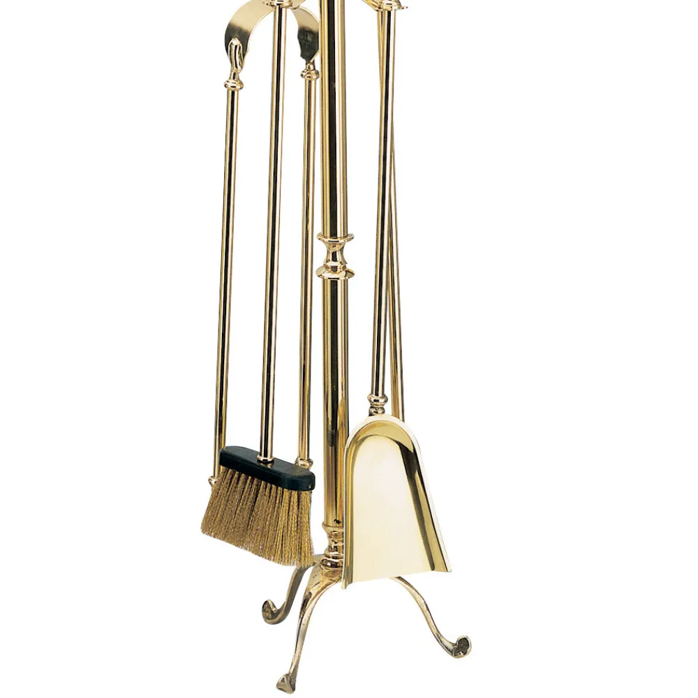 Werkzeughalter aus Messing , vollständig in Italien hergestellt. Der Werkzeughalter enthält 4 unverzichtbare Zubehörteile für die Kaminpflege: eine Schaufel , einen Haken , eine Bürste und eine Klammer .
