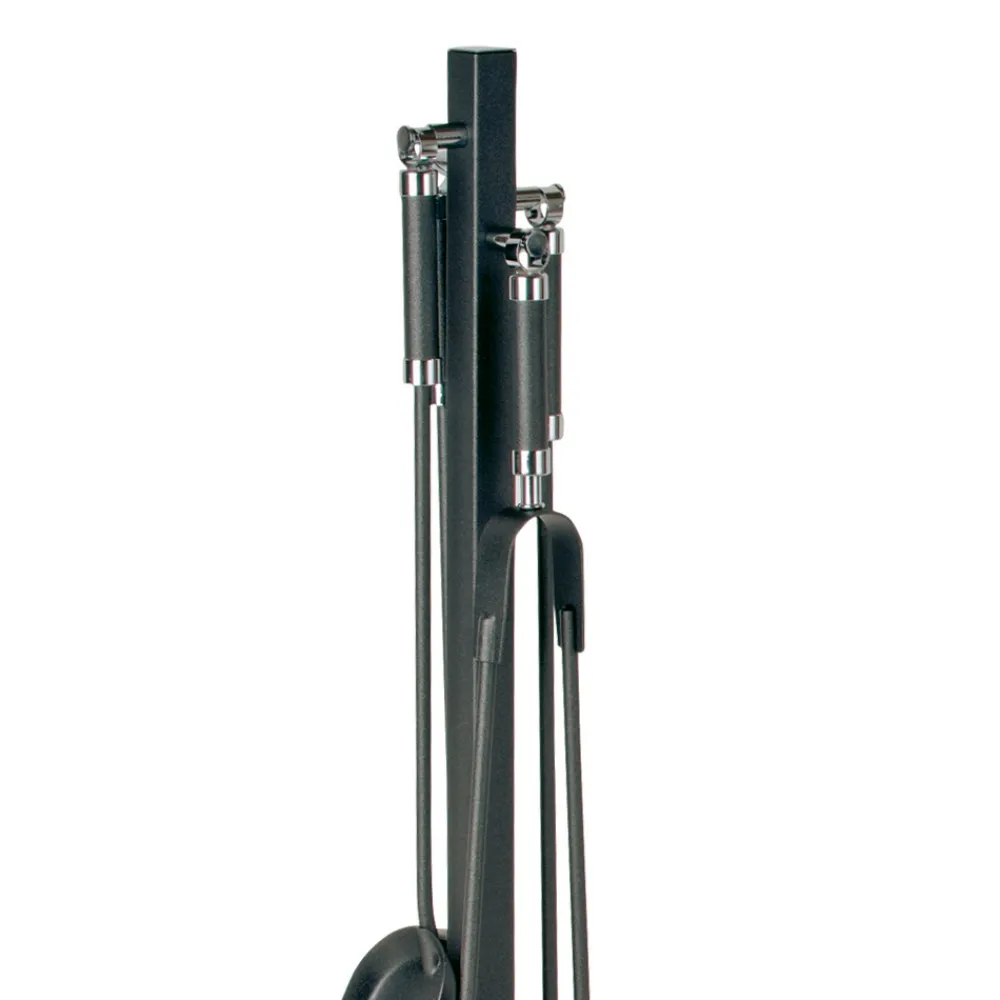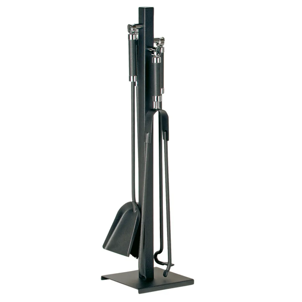 Werkzeughalter aus Metall oder Stahl , vollständig in Italien hergestellt. Der Werkzeughalter enthält 4 wichtige Kaminpflegezubehörteile : eine Klammer, eine Kehrschaufel, eine Bürste und einen Haken .