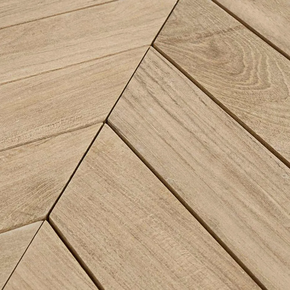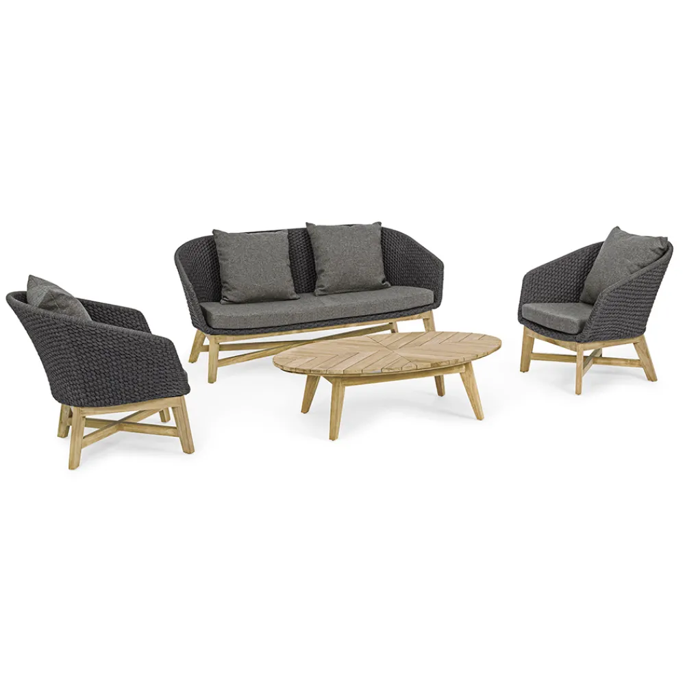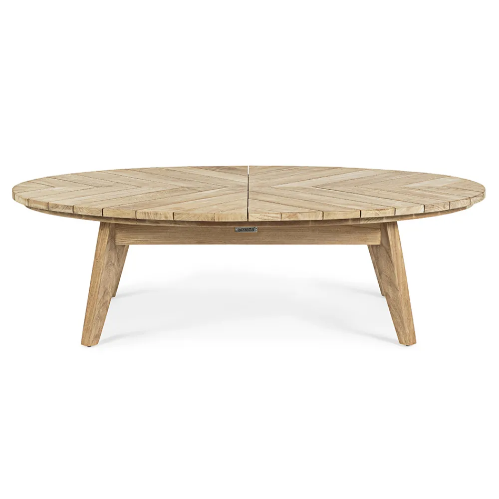 Couchtisch im Freien aus Teakholz mit ovaler Platte.