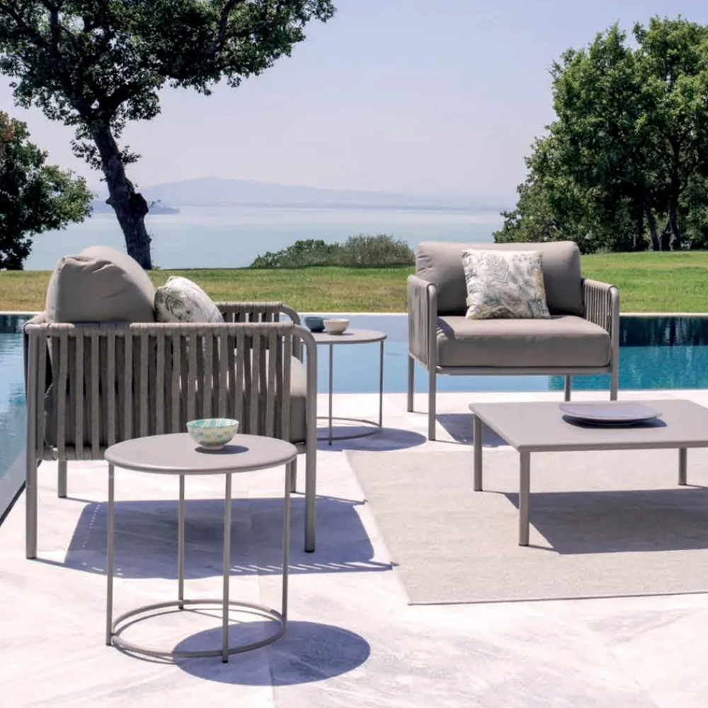 Das zeitgenössische Design und die Verflechtung geometrischer Grundformen schaffen eine dynamische und funktionale Atmosphäre . Mit diesem Möbelstück wird jedes Wohnzimmer im Freien als fließender und manchmal traumhafter Raum wahrgenommen, der sich perfekt in jede Umgebung einfügt.