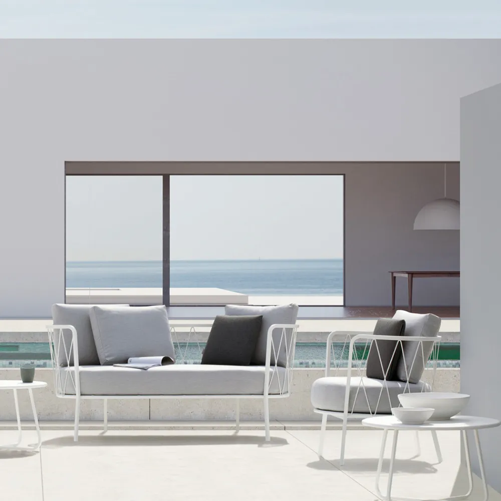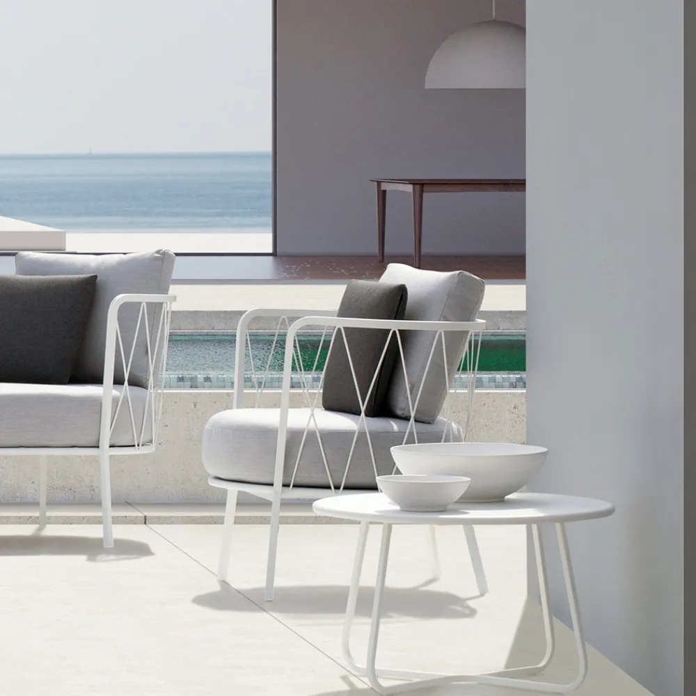 Das zeitgenössische Design und die Verflechtung geometrischer Grundformen dieser Kollektion schaffen eine dynamische und funktionale Atmosphäre . Mit diesem Möbelstück wird jedes Wohnzimmer im Freien als fließender Raum wahrgenommen, der sich perfekt in jede Umgebung einfügt.