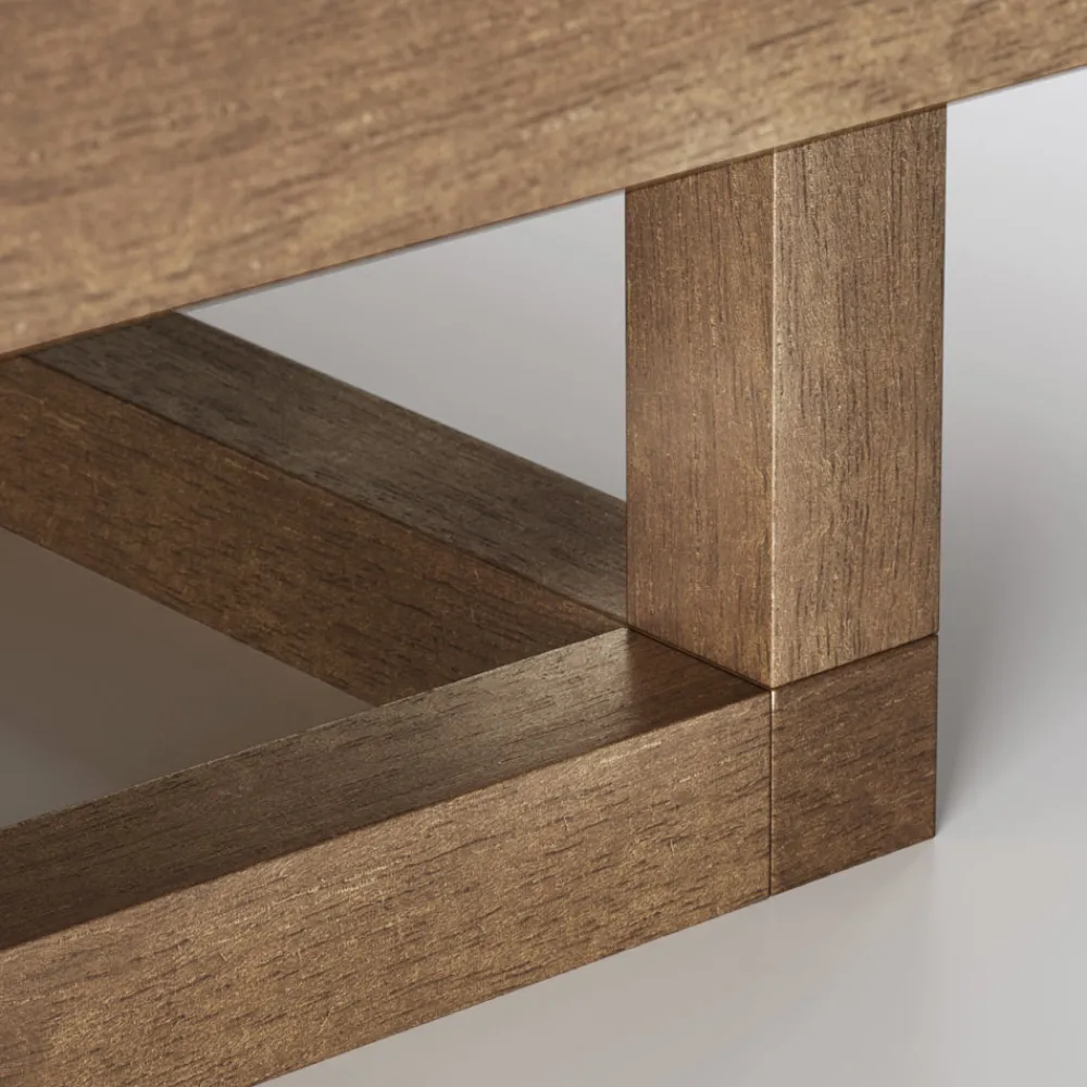 Niedriger Gartentisch mit Untergestell aus Iroko- Holz und Platte aus Steingut . Es besteht aus minimalistischen und funktionalen Elementen, deren Charakter sich aus der Liebe zum Detail und den Proportionen und Kombinationen horizontaler und vertikaler Elemente ergibt. Das Design seiner Platte zeichnet sich durch ein lineares geometrisches Muster aus, das durch die Kombination verschiedener Steinzeugplatten entsteht, die die Platte gestalten und dem Tisch Charakter und Persönlichkeit verleihen.