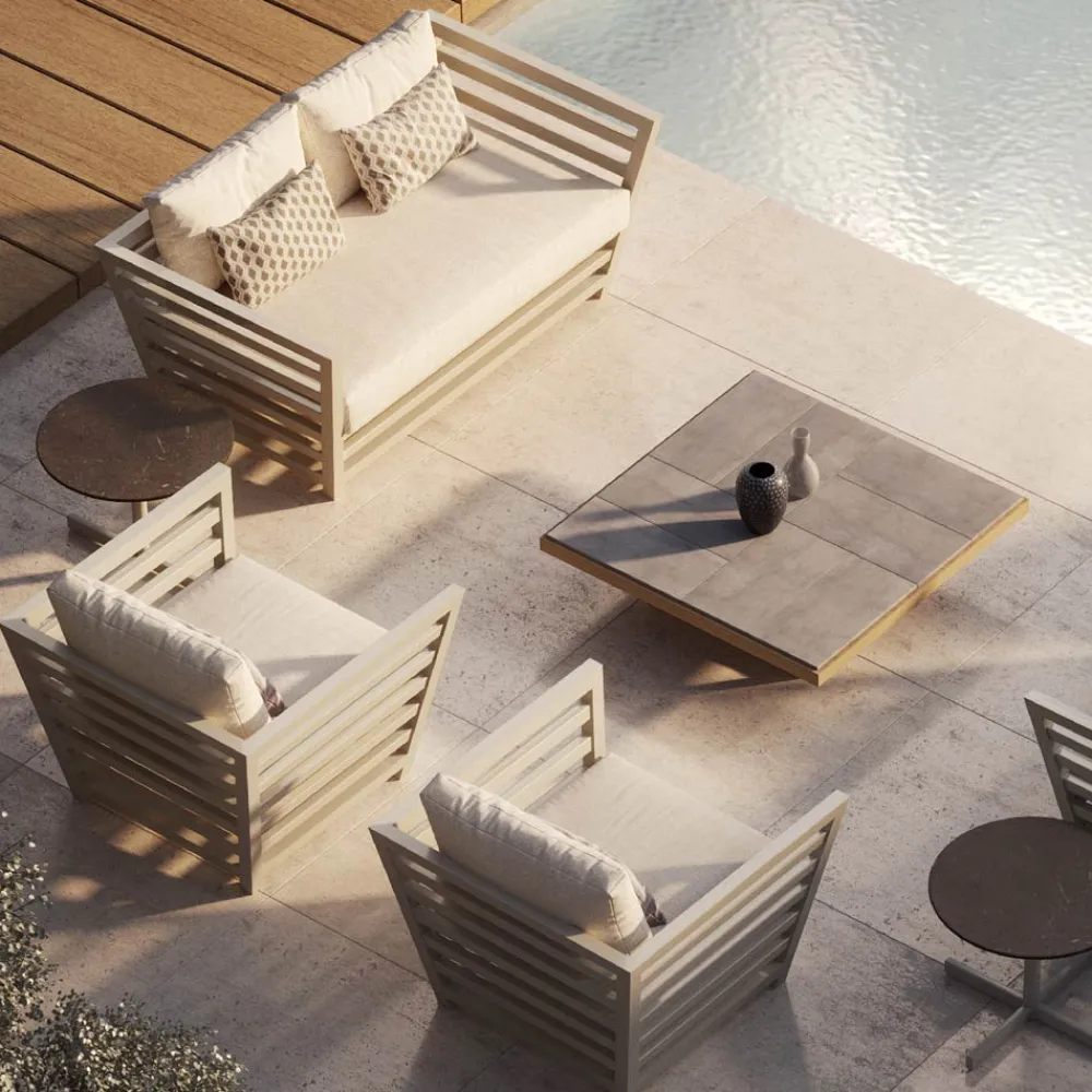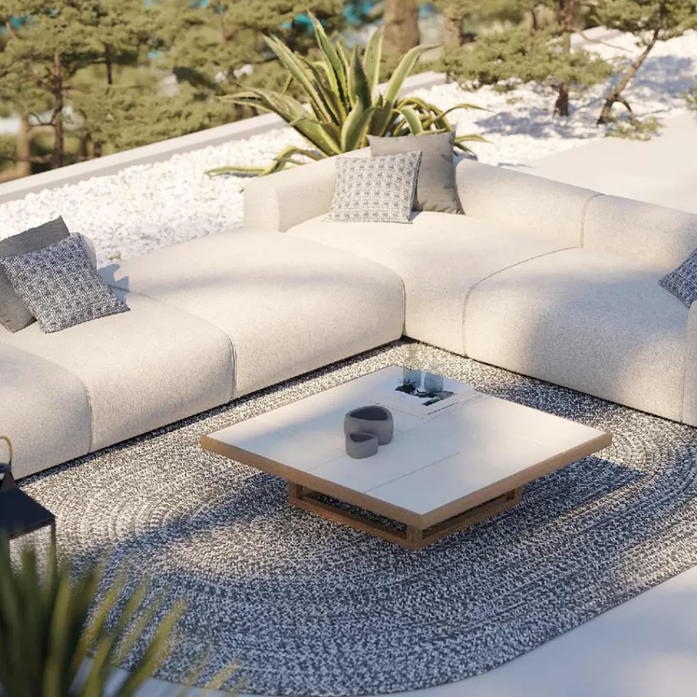 Niedriger Garten-Couchtisch aus Iroko-Holz und Platte aus Steinzeugplatten Made in Italy