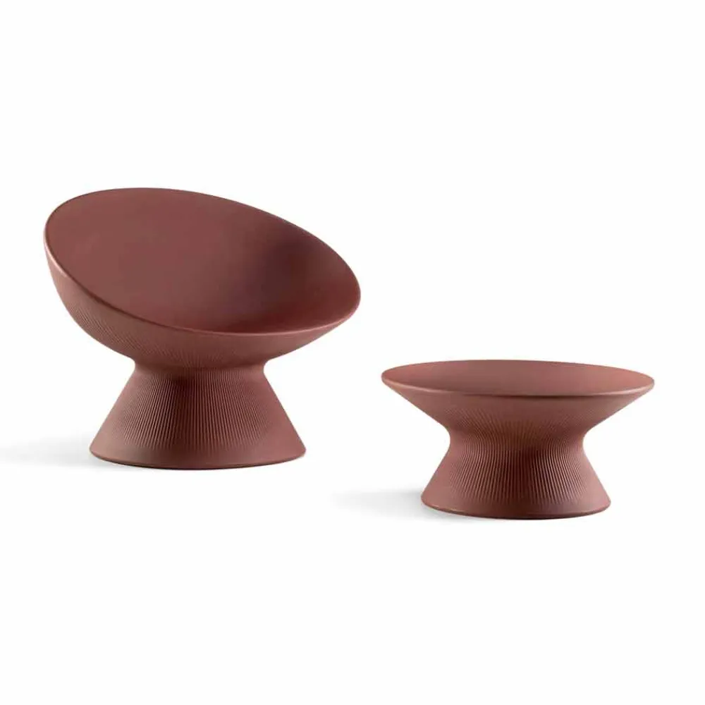 Garten-Couchtisch aus italienischem Polyethylen , einzigartig durch die besondere gestreifte Oberfläche, die die Basis auszeichnet und an natürliche Materialien erinnert. Sein Stil zeichnet sich durch Einfachheit und weiche und moderne Linien aus, die ihn zu einer perfekten Lösung für die unterschiedlichsten Außenumgebungen wie Gärten, Terrassen, Veranden, aber auch für Vertragsumgebungen machen, in denen er die Ästhetik mit einer originellen Note bereichern kann. gleichzeitig eine praktische Tischplatte und ein echtes Designobjekt darstellen.