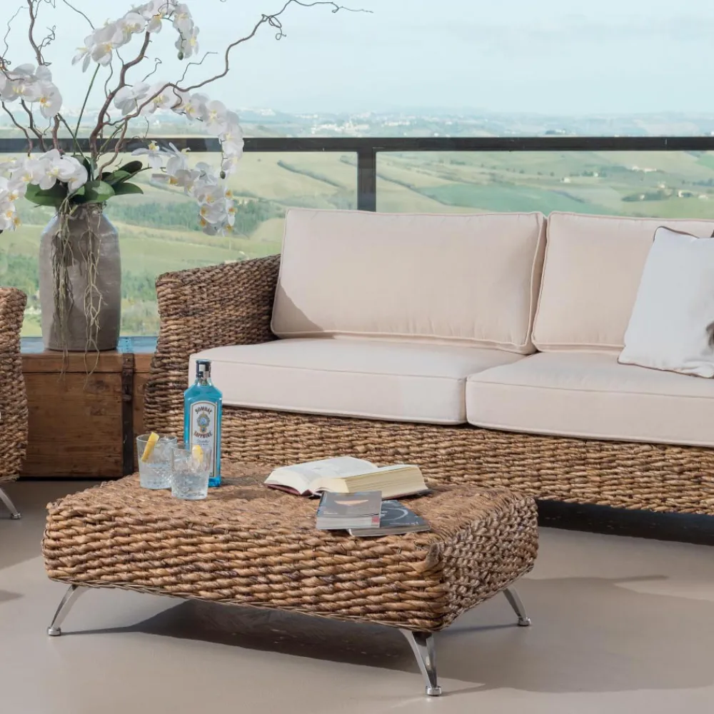 Das Wohnzimmer gehört zu einer ganzen Kollektion, die sich durch ihre modernen Töne sowohl im Design der Sitze als auch im Detail der Aluminium Füße auszeichnet. Gleichzeitig wird sie jedoch durch die Wärme des natürlichen Geflechts belebt, das handgefertigt aus einem raffinierten natürlichen Bananengeflecht ist.