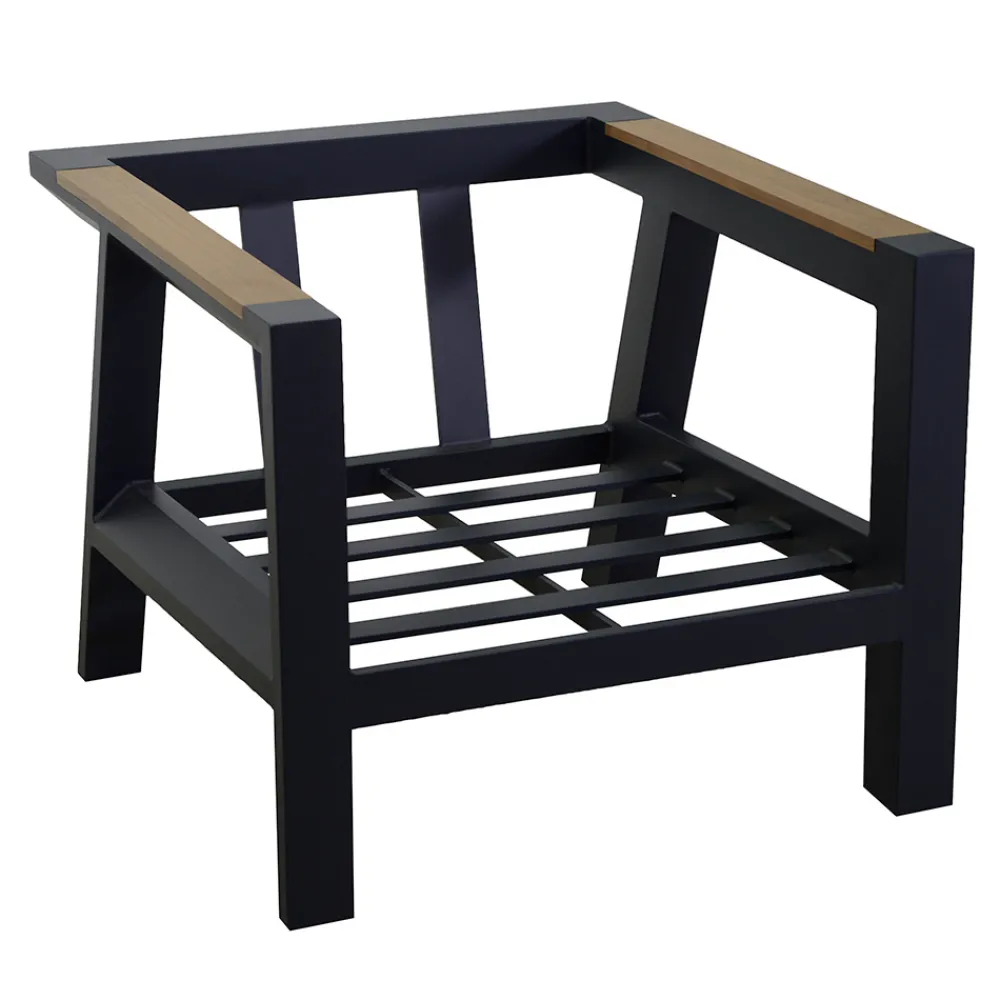 Ausgestattet mit Armlehnen mit Holzeinsätzen ist diese Lounge nicht nur ästhetisch ansprechend, sondern auch funktional und bietet eine komfortable Unterstützung für Momente der Entspannung im Freien.