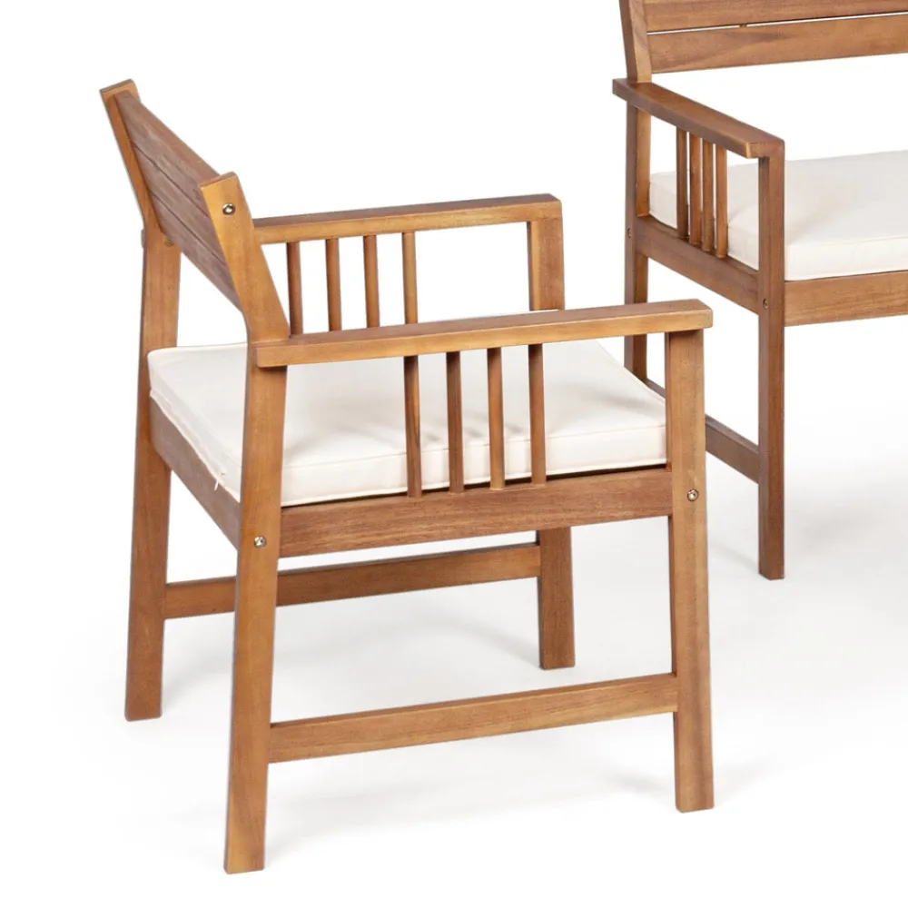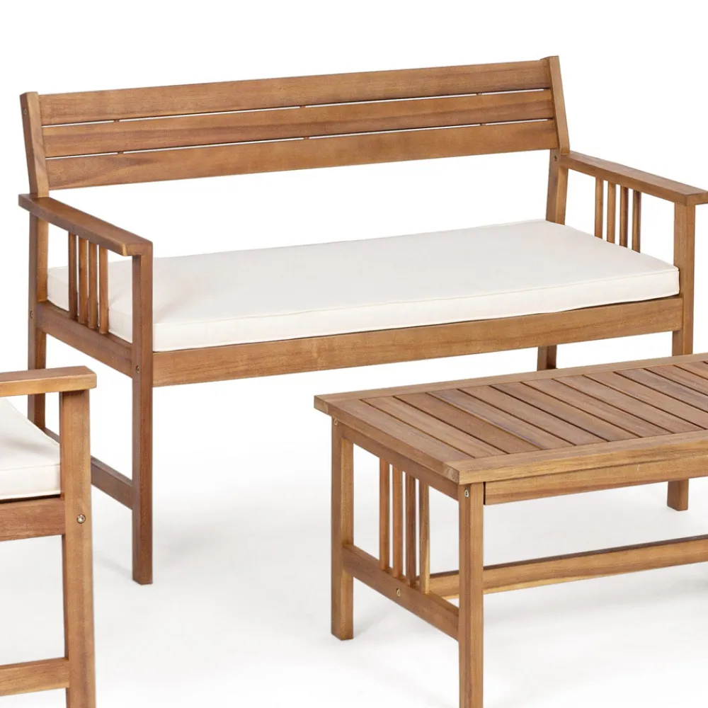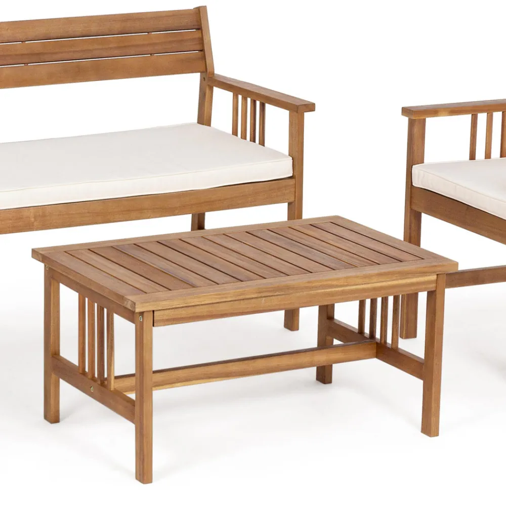 Gartenlounge bestehend aus 1 Sofa, 2 Sesseln und 1 Couchtisch aus Akazienholz.
