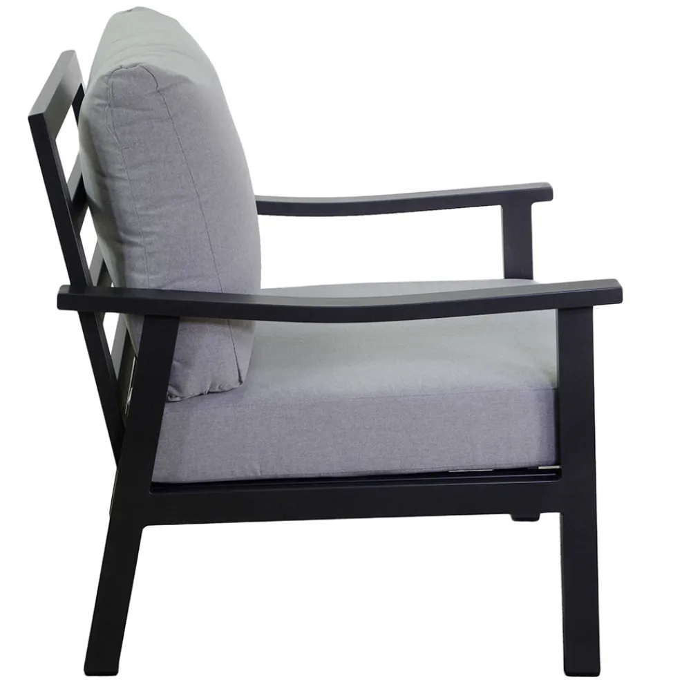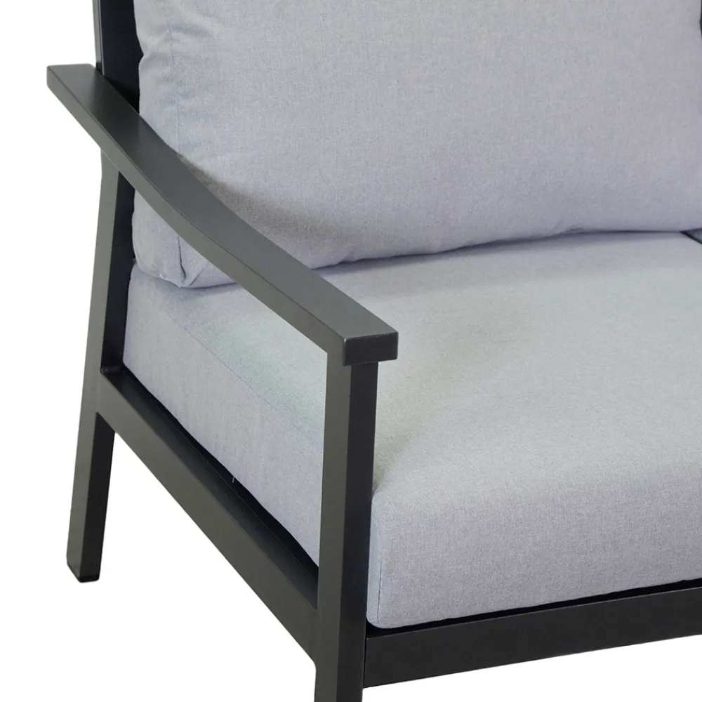 Entdecken Sie zeitlose Eleganz und Komfort mit unserer anthrazitfarbenen Aluminiumlounge. Jedes Stück ist so konzipiert, dass es absolute Entspannung bietet, dank der ultra-weichen Kissen aus hellgrauem Stoff, die zu Momenten des puren Wohlbefindens einladen. Der robuste Aluminiumrahmen sorgt für Langlebigkeit und Stabilität, ideal für den täglichen Gebrauch im Freien.