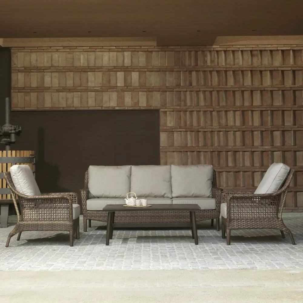 Aktualisieren Sie Ihren Außenbereich mit der Eleganz unseres Synthetik-Rattan-Lounge-Sets , perfekt für diejenigen, die Stil und Komfort kombinieren wollen. Dieses Set besteht aus einem Dreisitzer-Sofa, zwei Einzelsesseln und einem Couchtisch, die alle für maximale Entspannung und Langlebigkeit im Freien ausgelegt sind.