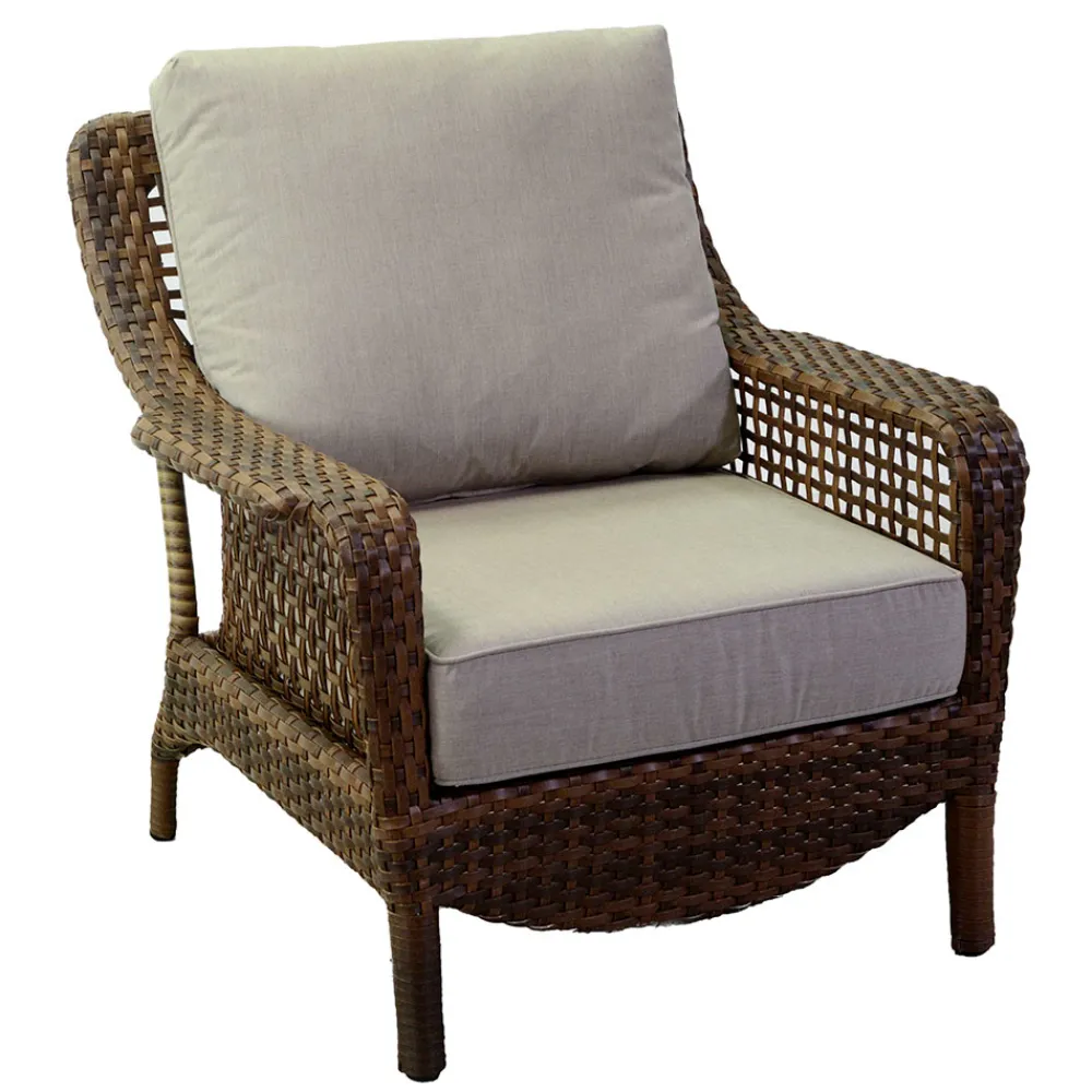 2 Sessel: Aluminiumrahmen mit walnussfarbenem Polyrattan bezogen, Sitz- und Rückenkissen in cremefarbenem Sunbrella-Stoff