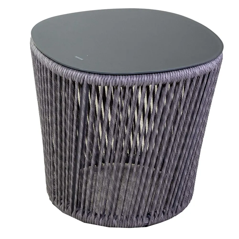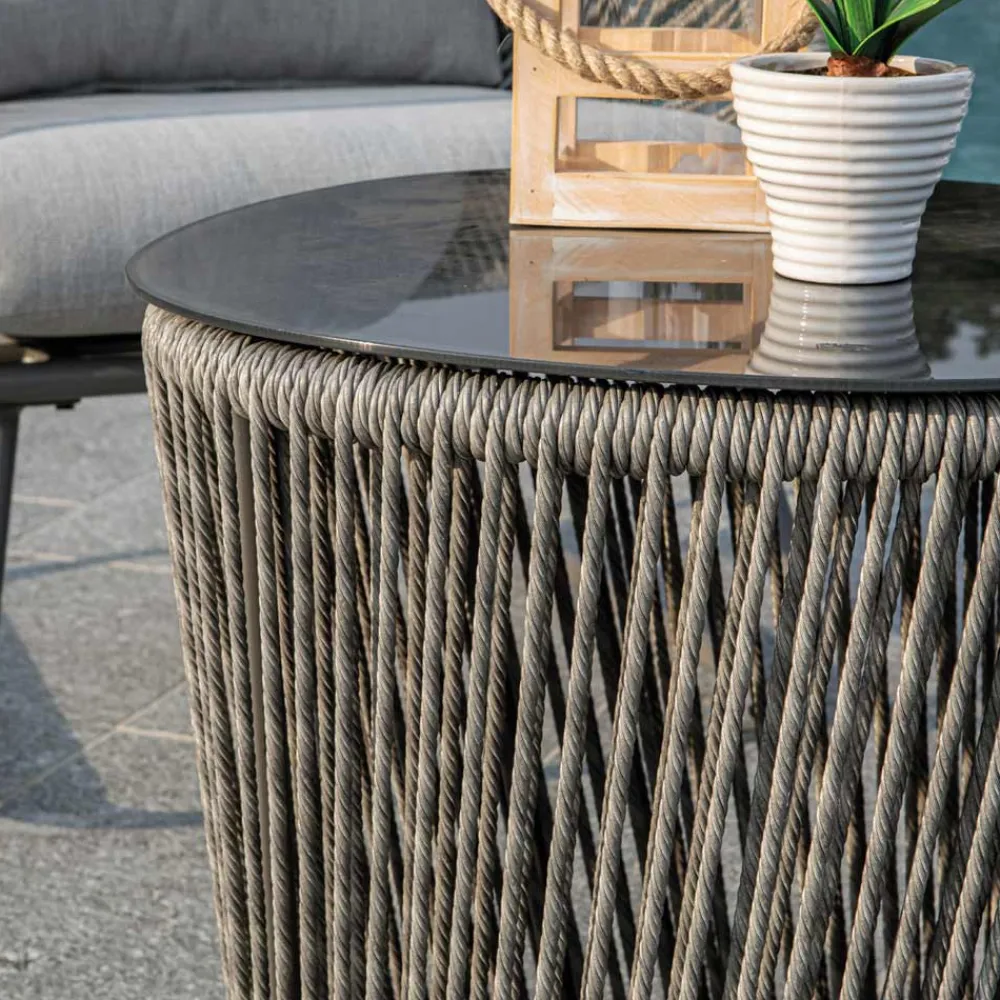 1 Couchtisch: Gestell aus rostfreiem, pulverbeschichtetem Aluminium in Grau, Seile aus geflochtenem Polyester in Grau und Platte aus Siebdruckglas.