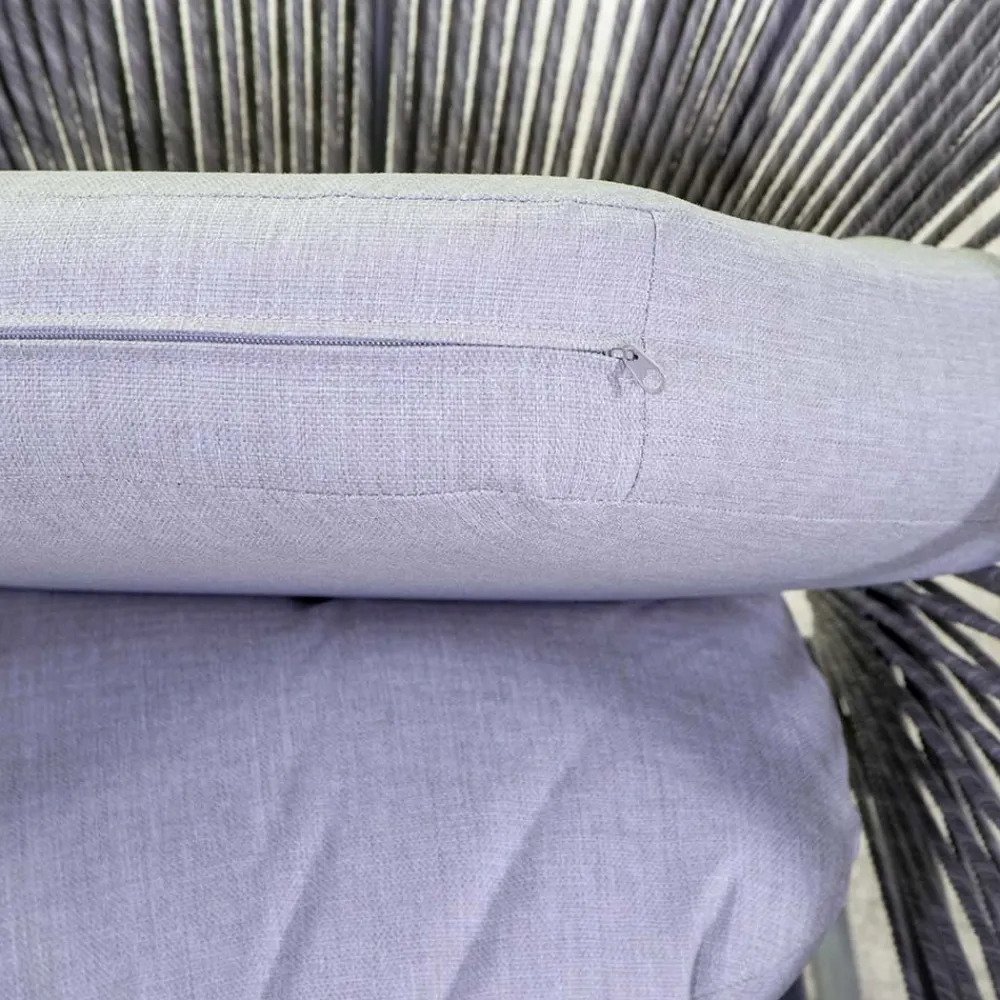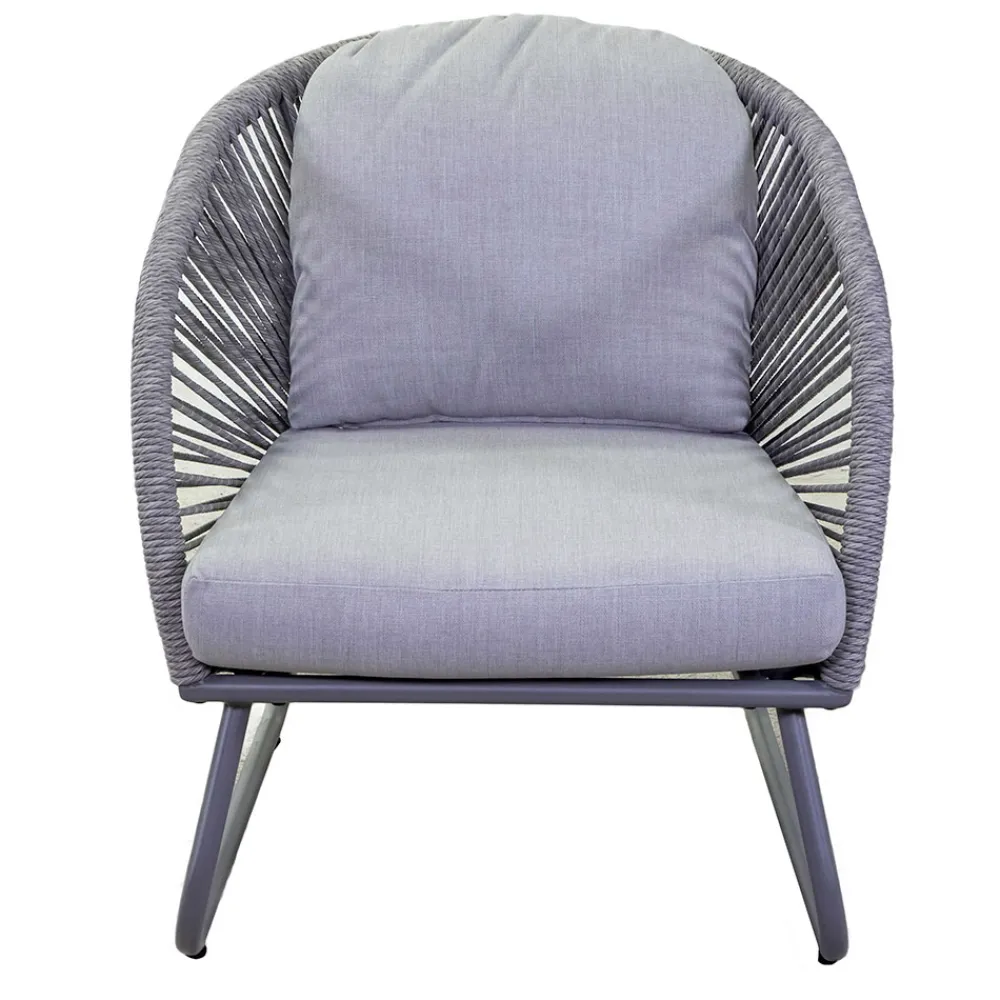 2 Sessel: Gestell aus rostfreiem pulverbeschichtetem Aluminium in Grau, Seile aus gewebtem Polyester in Grau, wasserabweisende Sitz- und Rückenkissen aus grauem Olefin, Dicke 10 cm.