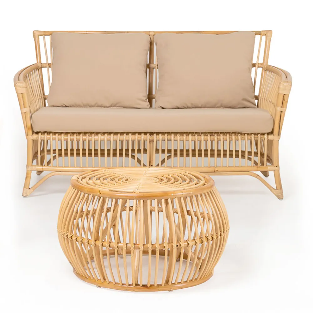 Outdoor Lounge Set bestehend aus 2 Sesseln , Sofa und Kaffeetisch aus handgeflochtenem natürlichem Rattan mit inkludierten Kissen in der Standardausführung der Serie „Stone Beige“.