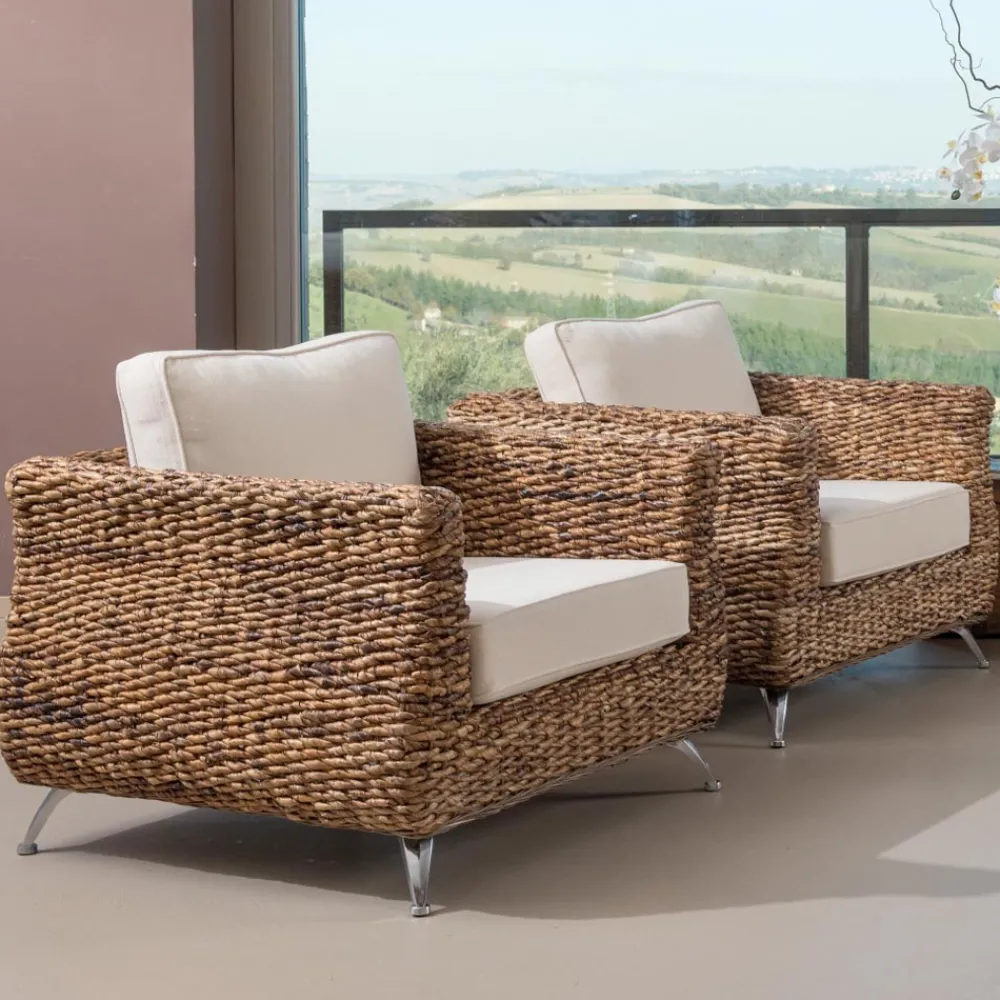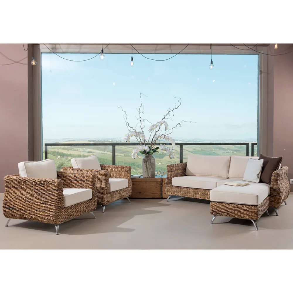 Das Wohnzimmer gehört zu einer ganzen Kollektion, die sich durch ihre modernen Töne sowohl im Design der Sitze als auch im Detail der Aluminium Füße auszeichnet. Gleichzeitig wird sie jedoch durch die Wärme des natürlichen Geflechts belebt, das handgefertigt aus einem raffinierten natürlichen Bananengeflecht ist.