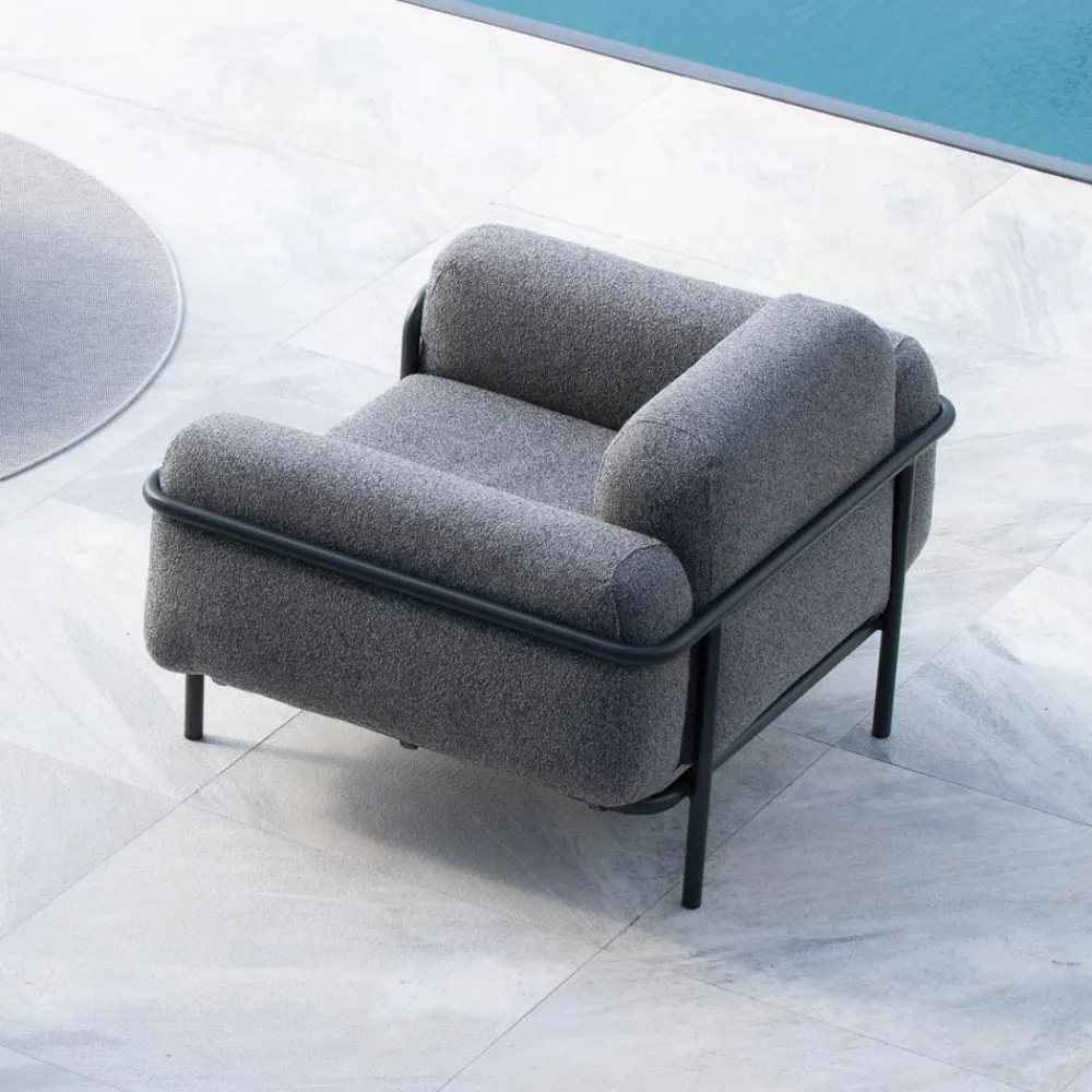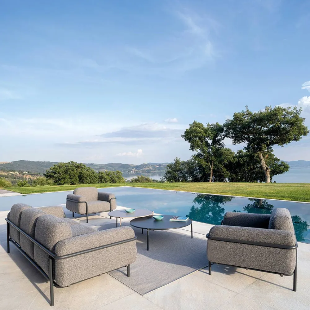 Komplett in Italien gefertigte Outdoor-Lounge mit Sofa und zwei Sesseln, bezogen mit 100 % Polypropylengewebe und pulverbeschichteter verzinkter Eisenstruktur . Eine Einrichtungslösung, die sich durch klare Linien und abgerundete Ecken auszeichnet, die wie eine warme Umarmung einhüllen und willkommen heißen. Ideal für die Gestaltung von Räumen mit zeitgenössischem Charme , zeichnet sich diese Gartenkomposition durch große Sitzflächen und weiche Profile aus, die durch eine geometrische Struktur mit minimalistischer Ästhetik hervorgehoben werden.