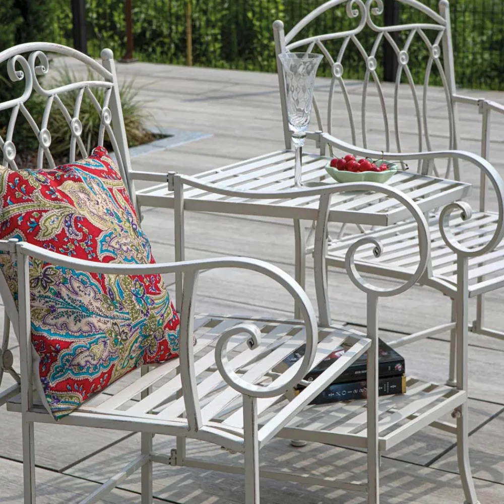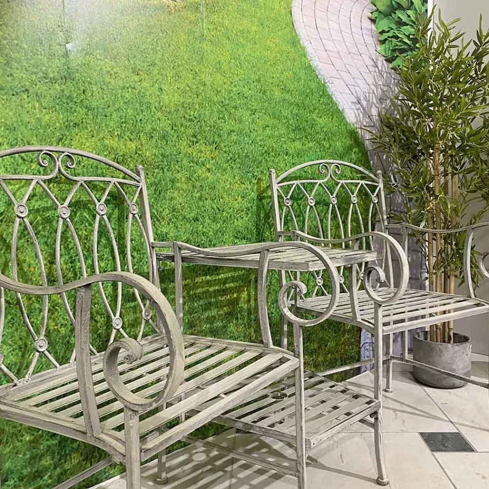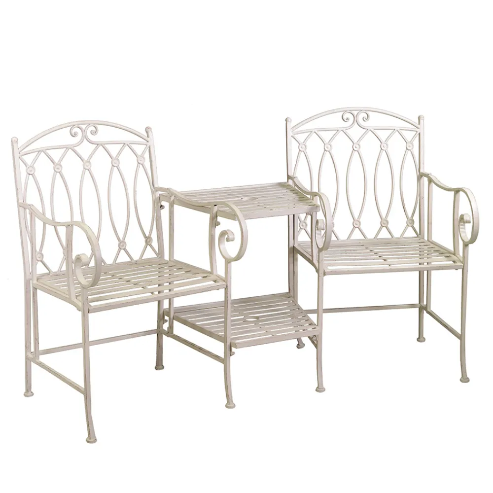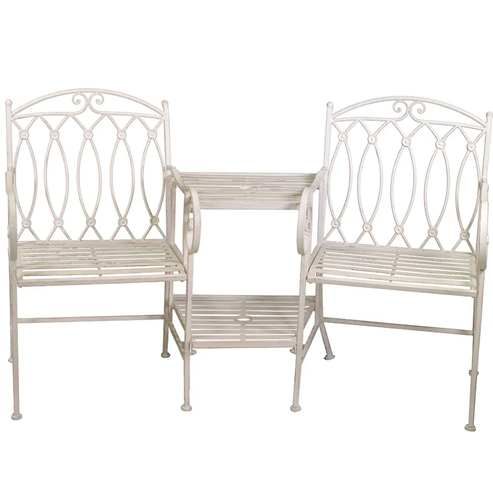 Lassen Sie sich von dem klassischen Charme und der zeitlosen Eleganz dieser Bank verzaubern, die ideal ist, um Ihren Garten oder Balkon in eine malerische Ecke der Entspannung zu verwandeln. Die komplett aus Metall gefertigte und zart lackierte Struktur besticht durch ihr ornamentales Geflecht und die eleganten, geschwungenen Details, die eine romantische und einladende Atmosphäre schaffen.
