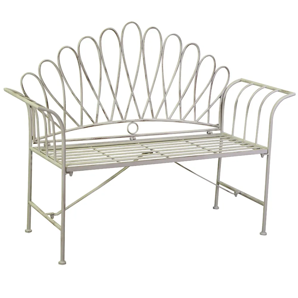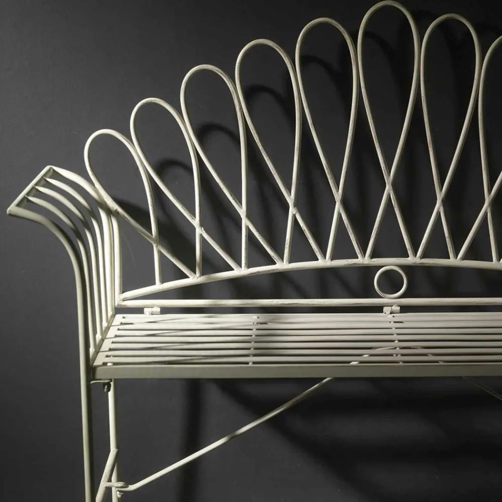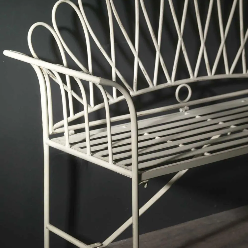 Outdoor-Bank aus elfenbeinfarbenem Metall.