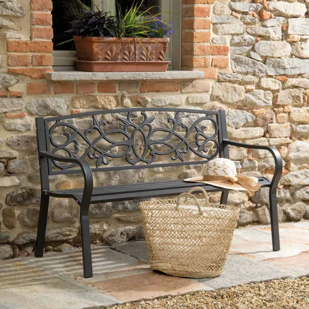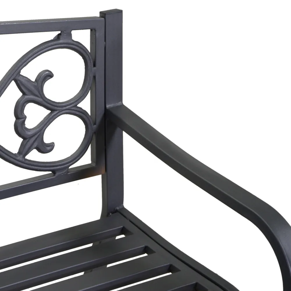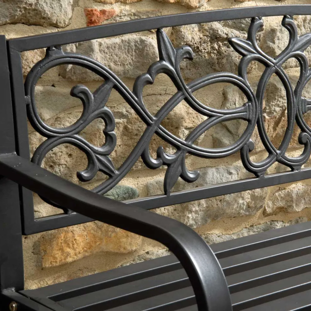 Das ornamentale Detail auf der Rückseite verbindet klassische Motive mit einem Hauch von Modernität und schafft einen optisch ansprechenden Blickpunkt. Gefertigt aus beständigem Metall, ist diese Bank so konzipiert, dass sie den Elementen standhält und ihre ästhetische Schönheit beibehält, ohne übermäßige Wartung zu erfordern.