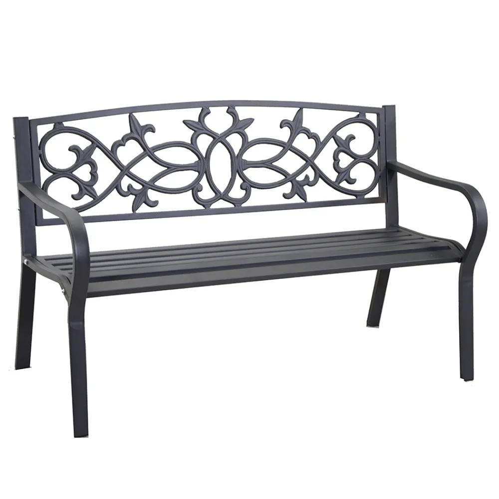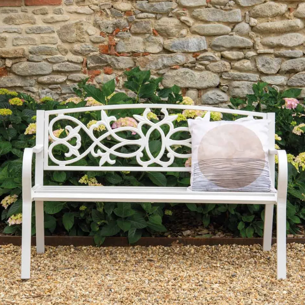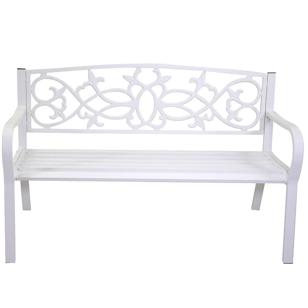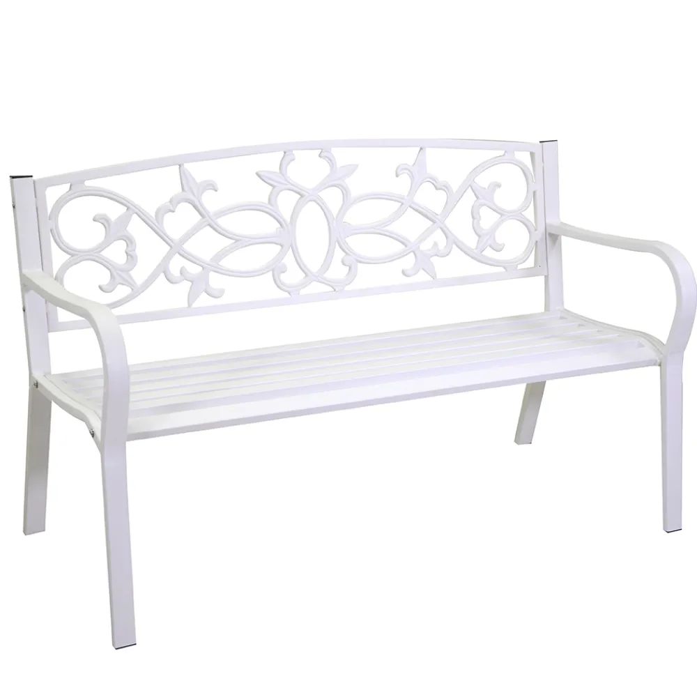 Das ornamentale Detail auf der Rückseite verbindet klassische Motive mit einem Hauch von Modernität und schafft einen optisch ansprechenden Blickpunkt. Gefertigt aus beständigem Metall, ist diese Bank so konzipiert, dass sie den Elementen standhält und ihre ästhetische Schönheit beibehält, ohne übermäßige Wartung zu erfordern.