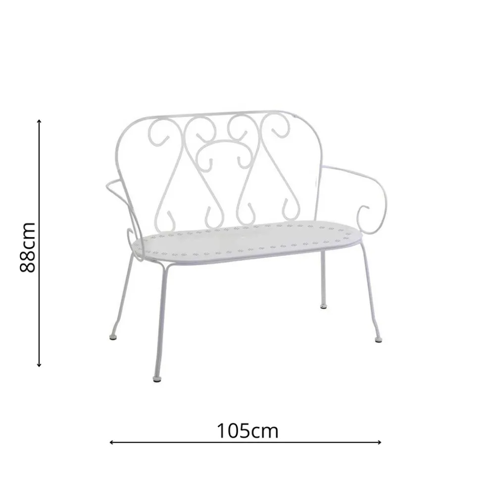 Die Bank ist aus witterungsbeständigem Metall gefertigt, ideal für entspannende Momente im Garten, auf der Terrasse oder in einer gemütlichen Ecke Ihrer Terrasse. Die Liebe zum Detail und die Verarbeitung machen diese Bank vielseitig und geeignet für verschiedene dekorative Stile, von der klassischen und romantischen bis zur modernen und minimalistischen.