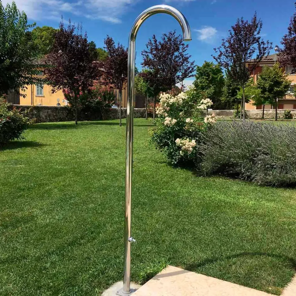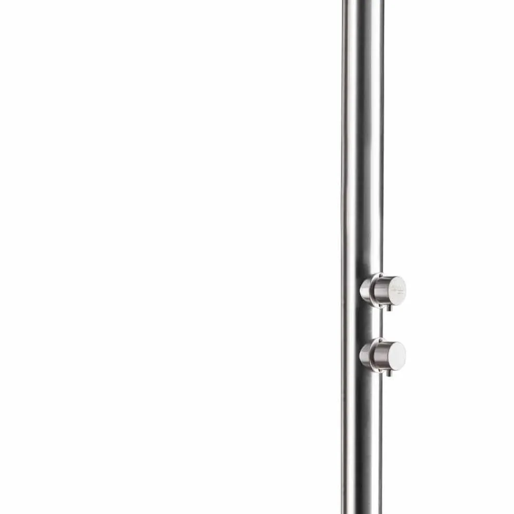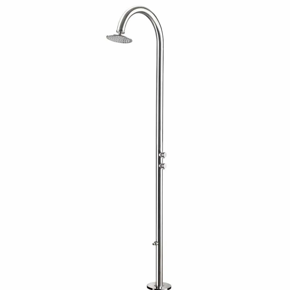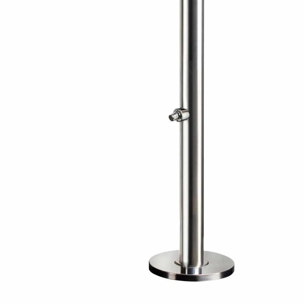 Außendusche aus poliertem Edelstahl AISI 316L (2 mm stark), hergestellt in Italien. Die Idee stammt zu 100 % aus italienischer Handwerkskunst und gewährleistet dank der Verwendung hochwertiger Rohstoffe höchste technische Leistung. Das Ergebnis ist ein ebenso funktionales wie elegantes und stilvolles Produkt. Ideal für Bereiche wie Strandresorts und touristische Einrichtungen, aber auch für private Bereiche wie Schwimmbäder und Gärten, stellt diese Außendusche eine vielseitige Lösung dar, die den Ansprüchen aller gerecht wird, die Wert auf Funktionalität und Ästhetik legen.