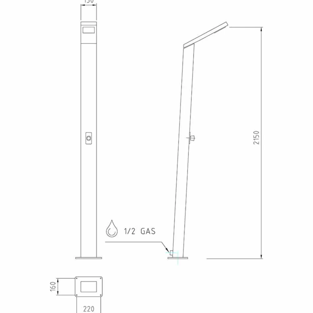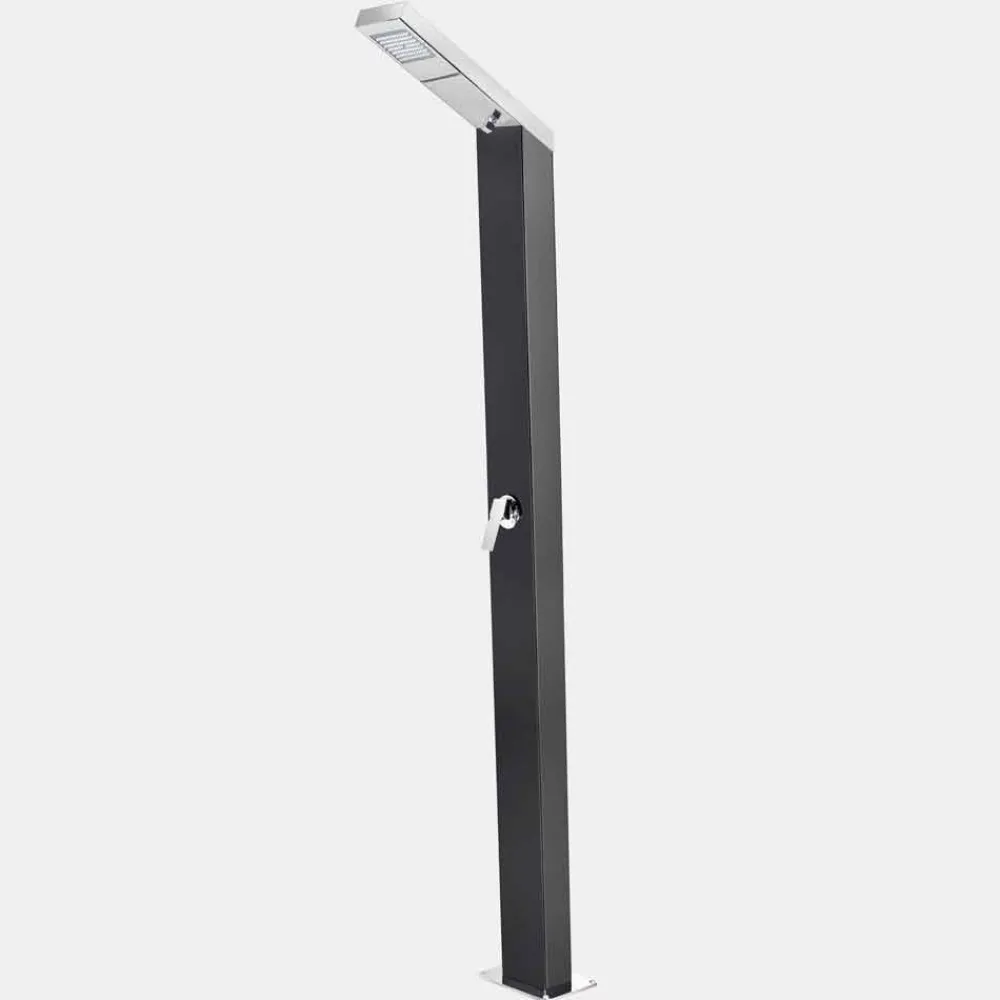 Dieses Produkt vereint die Eleganz seiner Formen und Linien mit hohem technischen Potenzial in jedem Außenbereich und ist somit die perfekte Duschsäule für den Außenbereich, die sowohl ästhetische als auch funktionale Ansprüche erfüllt. Die beiden Düsen, Regen- und Wasserfall, bieten eine wohltuende Massage und schaffen eine kleine, der Entspannung gewidmete Ecke in Außenbereichen wie Strandresorts und touristischen Einrichtungen, aber auch in privaten Bereichen wie Schwimmbädern und Gärten. Die rechteckige Struktur ermöglicht eine große Wärmeaufnahmefläche und hält das Wasser den ganzen Tag über warm. Daher ist es wichtig, die Dusche an einem offenen und besonders sonnigen Ort zu platzieren, damit die Sonnenstrahlen das Wasser im Tank optimal erwärmen können.