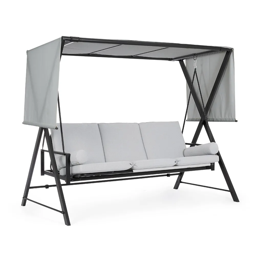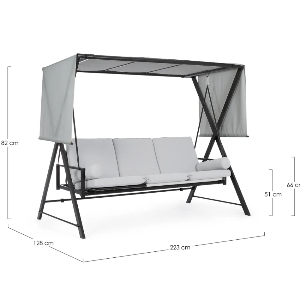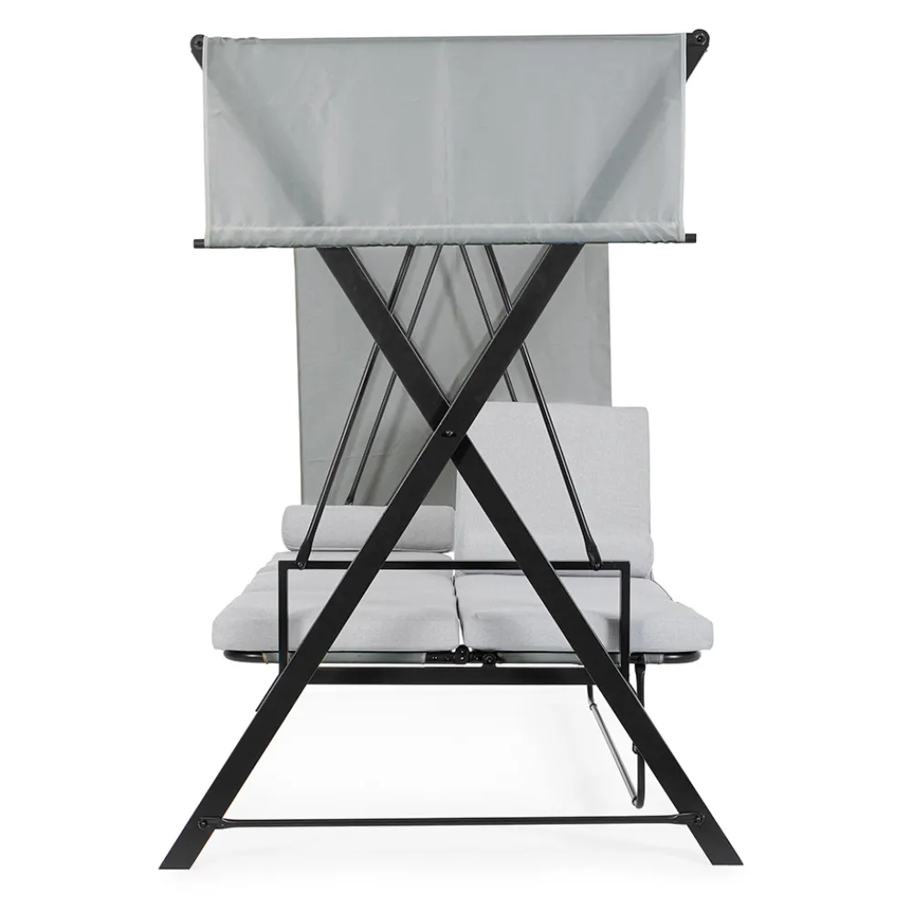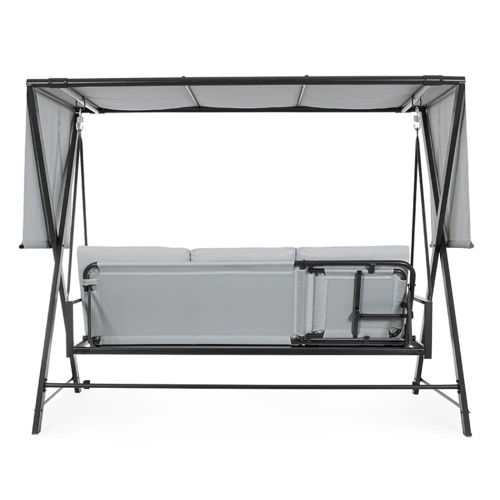 Außenschaukel mit Stahlkonstruktion , die durch Phosphatierung und Pulverbeschichtung (Polyester) für den Außenbereich behandelt wurde, 60 x 28 mm Stangen, ø 28 mm Rohre, manuell verstellbares Schiebedach in freier Position und Sitz aus 220 g/m2 Polyester, nicht abnehmbare Kissen aus gesponnenem Polygewebe 200 g/m2 . Dank der klappbaren Rückenlehne lässt es sich in ein 180 x 115 cm großes Bett verwandeln . Sitze und Rückenlehnen lassen sich in 2 Positionen neigen, um die Nutzung einer Sonnenliege zu ermöglichen.