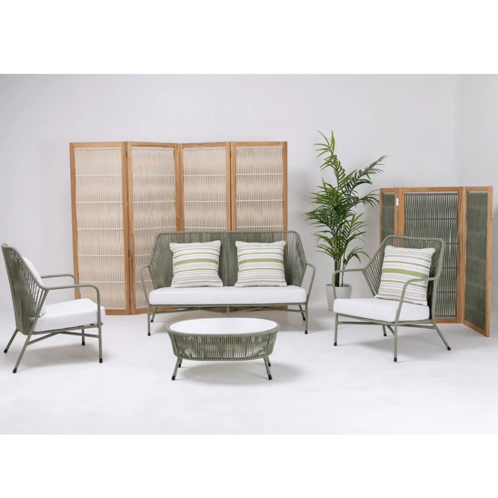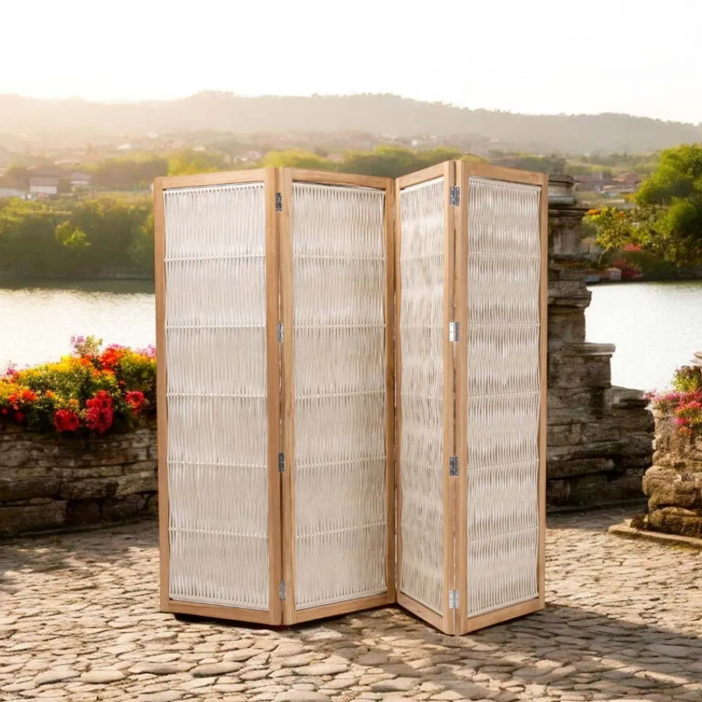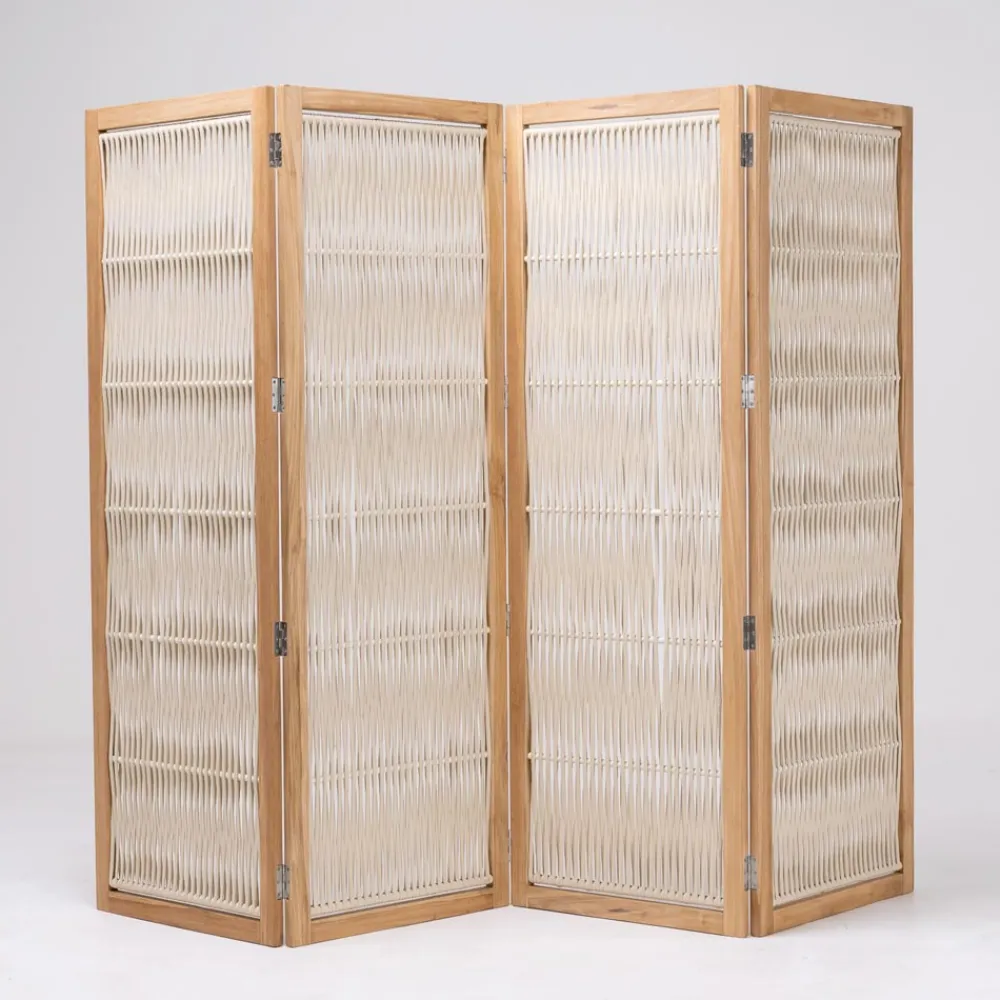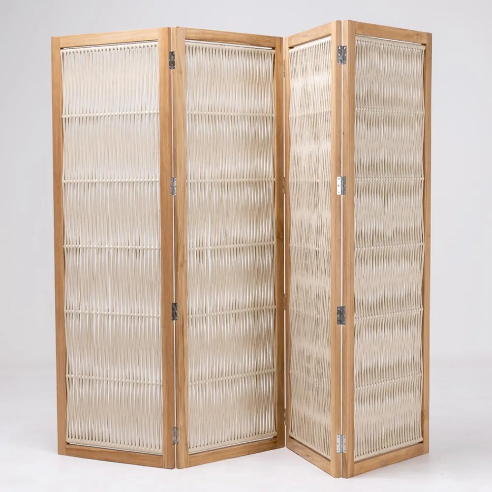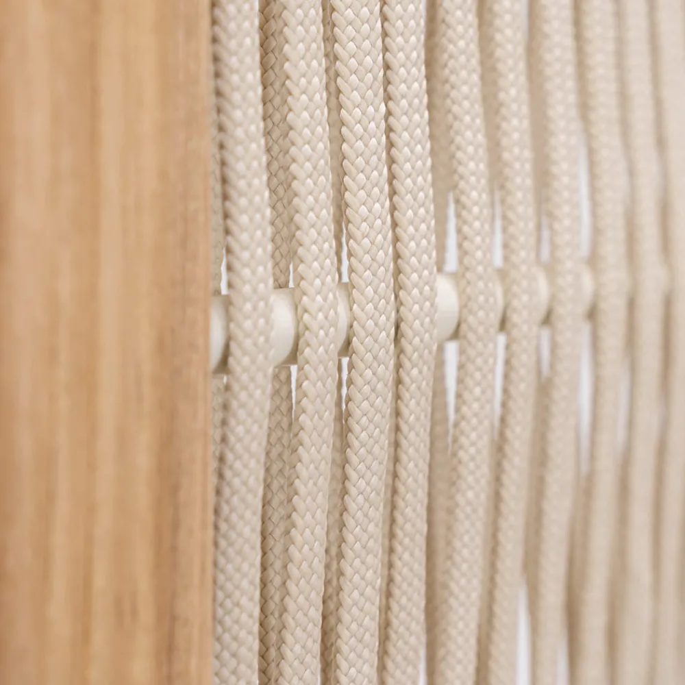 Trennwand für den Außenbereich mit Struktur aus Teakholz und Aluminium, Polypropylen-Seilgeflecht (perlweißes Finish) und Olefin (Desert Mix Finish).
