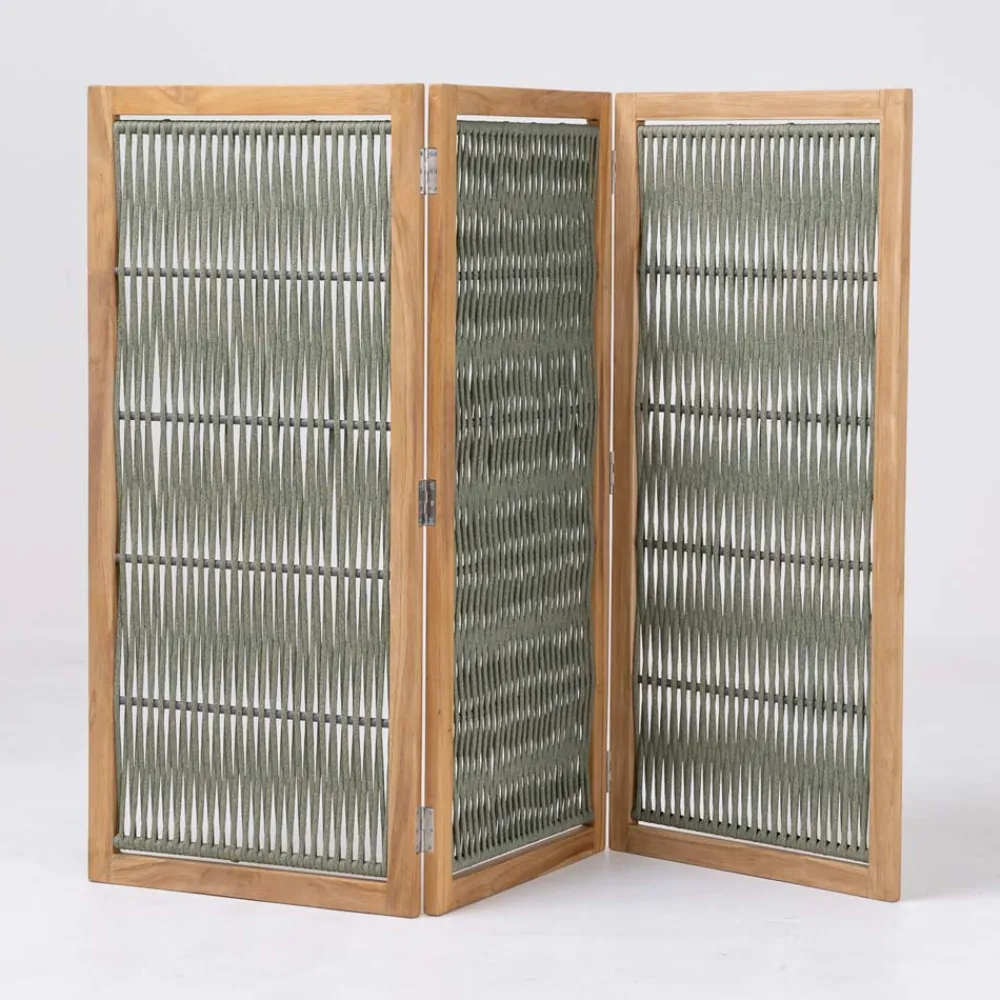 Dieser Gartentrenner stellt eine elegante Designlösung zur Definition von Außenbereichen dar und bietet eine Kombination aus Privatsphäre und Stil. Die Struktur aus Teakholz und Aluminium verschmilzt mit den Paneelen aus geflochtenem Seil und kombiniert die Wärme des organischen Materials mit der Funktionalität eines mobilen Raumteilers.
