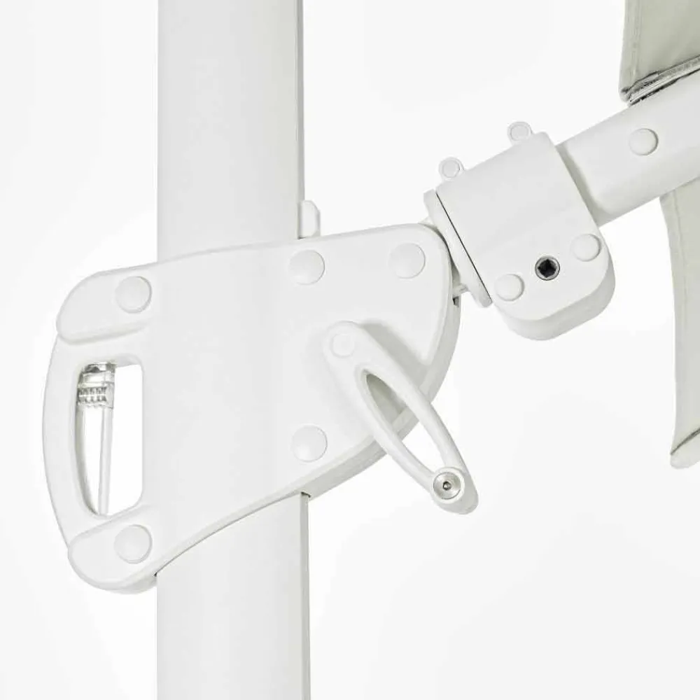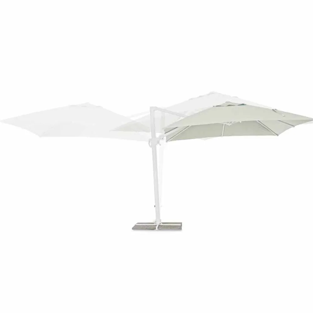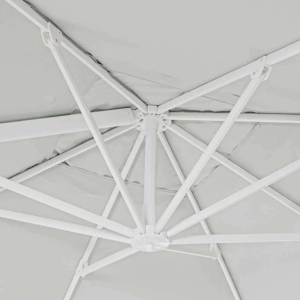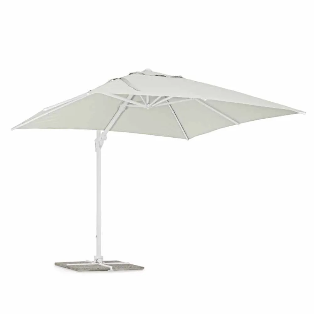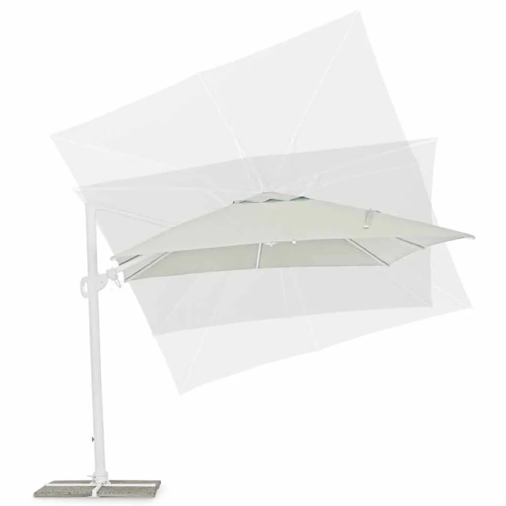 Pulverbeschichtete Aluminiumstruktur (Polyester). 90x60mm Stange, 8 25x17mm Rippen, 250gr / m2 Naturpolyestergewebe mit Pa (Polyamid) Beschichtung, Stahlkreuzbasis, 360 ° drehbare Stange mit Pedal. Vertikale Neigung mit 6-Positionen-Griff, ausgestattet mit einem Rechts-Links-Kippsystem für Regenschirm.