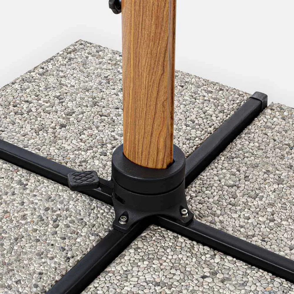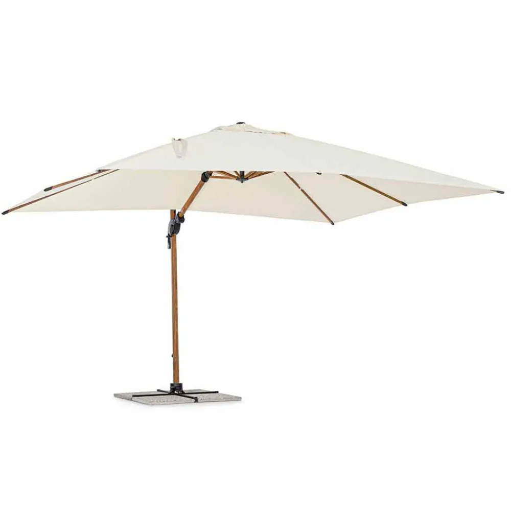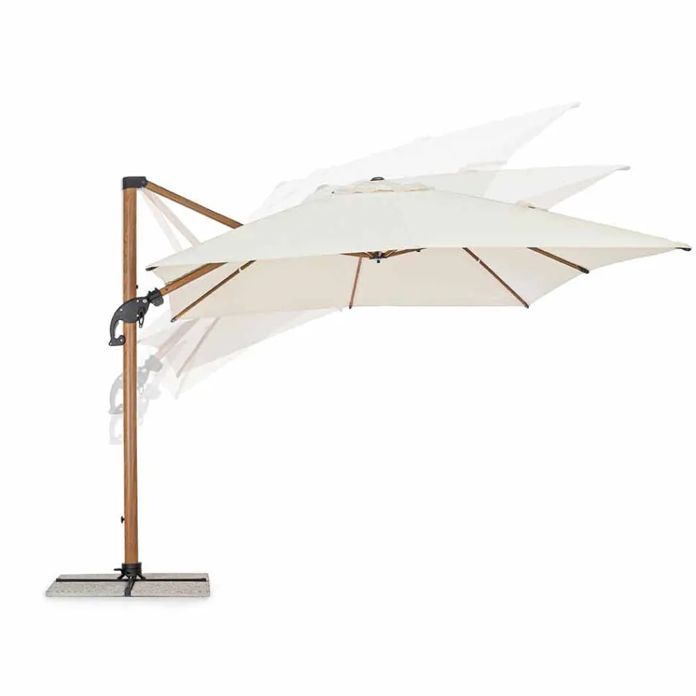 Aluminiumstruktur , pulverbeschichtet (Polyester) mit Holzeffekt. 90x60mm Stange, 8 Rippen 25×17 mm. Beige Polyestergewebe 250 gr / m2 mit PA (Polyamid) Beschichtung. Kreuzfuß aus Stahl . 360° drehbare Stange mit Pedal. Vertikale Neigung mit 5-Positionen-Griff. Ausgestattet mit einem Rechts-Links-Schirmkippsystem . Inklusive Schirmhülle .